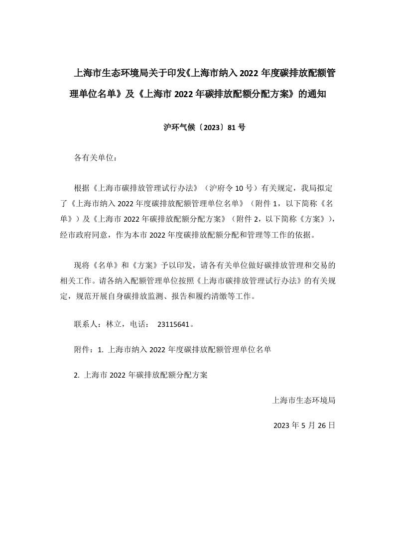 上海市生态环境局关于印发《上海市纳入2022年度碳排放配额管理单位名单》及《上海市2022年碳排放配额分配方案》的通知沪环气候(2023)81号各有关单位:根据《上海市碳排放管理试行办法》(沪府令10号)有关规定,我局拟定了《上海市纳入2022年度碳排放配额管理单位名单》(附件1,以下简称《名单》)及《上海市2022年碳排放配额分配方案》(附件2,以下简称《方案》),经市政府同意,作为本市2022年度碳排放配额分配和管理等工作的依据。现将《名单》和《方案》予以印发,请各有关单位做好碳排放管理和交易的相关工作。请各纳入配额管理单位按照《上海市碳排放管理试行办法》的有关规定,规范开展自身碳排放监测、报告和履约清缴等工作。联系人:林立,电话:23115641。附件:1.上海市纳入2022年度碳排放配额管理单位名单2.上海市2022年碳排放配额分配方案上海市生态环境局2023年5月26日