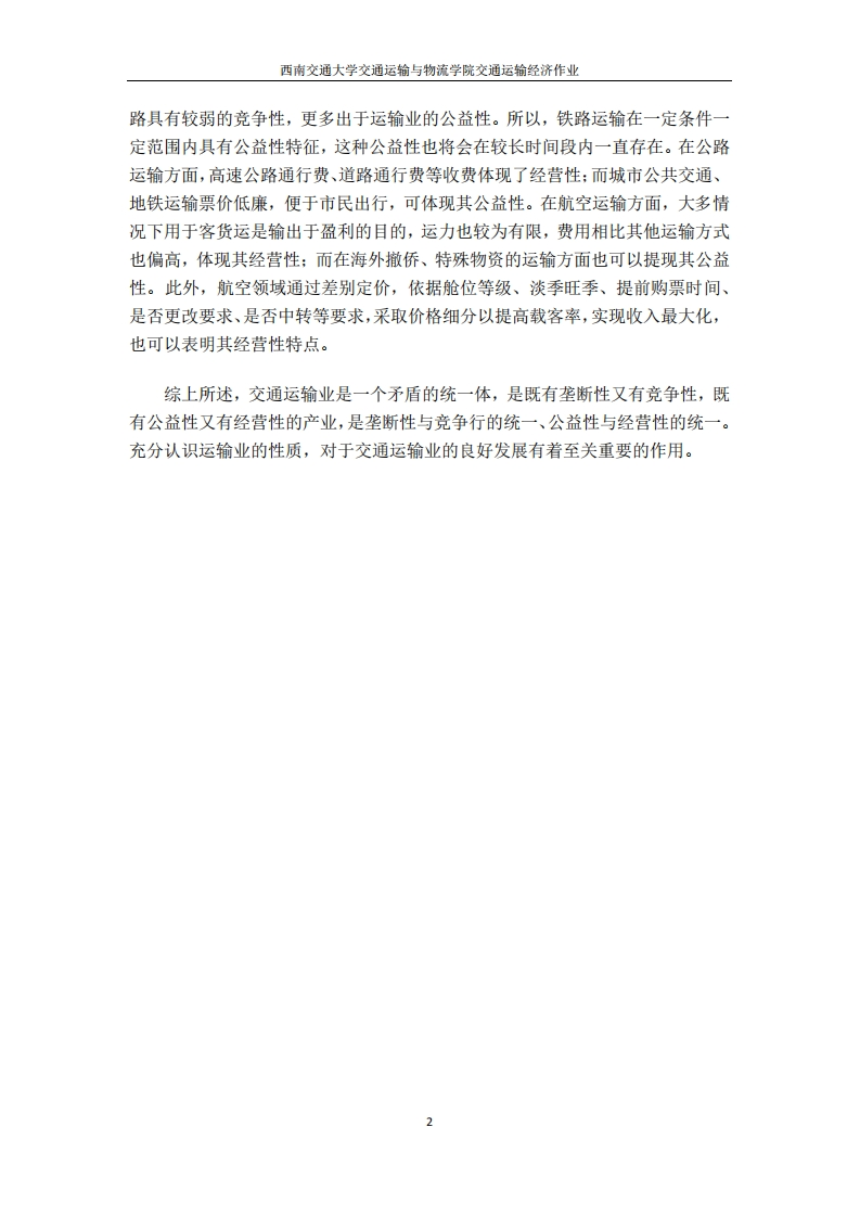 西南交通大学交通运输与物流学院交通运输经济作业对运输业的垄断性与竞争性、公益性与经营性的认识(王倩妮西南交通大学交通运输与物流学院交通2015-02班2015112956)我国运输业由五种运输方式构成,公路、铁路、航空、水运、管道,五个方面具备各自的经济技术特征与发展优势领域,因此在一些方面看来运输业具有垄断性:而由于运输需求的多样,以及某几种运输方式间可以相互替代,在另一些方面看来,运输业又具有竞争性。运输业作为公共服务业,获取一定利润,具有经营性:又基于其国民经济的基础产业特点,具有公益性。下面我将谈谈我对运输业垄断性与竞争性、公益性与经营性的认识。垄断,指一个没有相近替代品的产品的唯一卖者的企业。运输业相比一般的市场更容易行成垄断,而分析垄断性的类型,又可以将运输业的类型分为国家垄断与企业垄断。运输业涉及基础设施的建设、投资、运营,投入资金大,资金回收慢,普通企业、个人难以承受巨额支出,必须以国家财政支持,大部分是国家建设、国家经营。在运输业内,行业巨头企业,因为掌握最优的资源,在行业内处于垄断地位。以航空运输产业为例,空中交通管制业务、机场服务、航空保障服务,因涉及航空运输产业的生产调度和空中交通指挥的安全保障服务,具有“垄断性”。而在铁路运输领域,中国铁路总公司,就对国家铁路运输具有垄断性。运输业的竞争性,既体现在不同运输方式之间,也体现在同一运输方式内部。不同运输方式间存在一定替代性,因此具有竞争性。例如在济南至成都间既可以选择铁路出行,也可以选择航空出行,人们会考虑对于时间要求和金钱要求的迫切程度,以选取合适的出行方式,这就是不同运输方式间的竞争。而同种运输方式内,主要是不同运营公司之间的竞争,以航空运输为例,有价格高服务好的主流公司,也有廉价航空以自己独特的理念在市场中分得一杯羹。对于运输业公益性与经营性并存方面,通过中国铁路总公司关于自身任务的阐述可以看出,阐述如下:“中国铁路总公司以铁路客货运输服务为主业,实行多元化经营。负责铁路运输统一调度指挥,负责国家铁路客货运输经营管理,承担国家规定的公益性运输,保证关系国计民生的重点运输和特运、专运、抢险救灾运输等任务。负责拟订铁路投资建设计划,提出国家铁路网建设和筹资方案建议。负责建设项目前期工作,管理建设项目。负责国家铁路运输安全,承担铁路安全生产主体责任。”一方面,铁路依靠货运和部分客运服务获取利益,每年也会通过客货运量衡量是否获利以及运载能力大小,可见其经营性:另一方面,铁路又承担国家规定的公益性运输,譬如抢险救灾、特殊物资运送、国防安全、国土开发等等。而且,铁路的线路布局不仅由利益指向,主要是依照国家发展方针路线政策为主要依据的,如青藏铁路、南疆铁路的建设,在经济欠发达地区,铁1