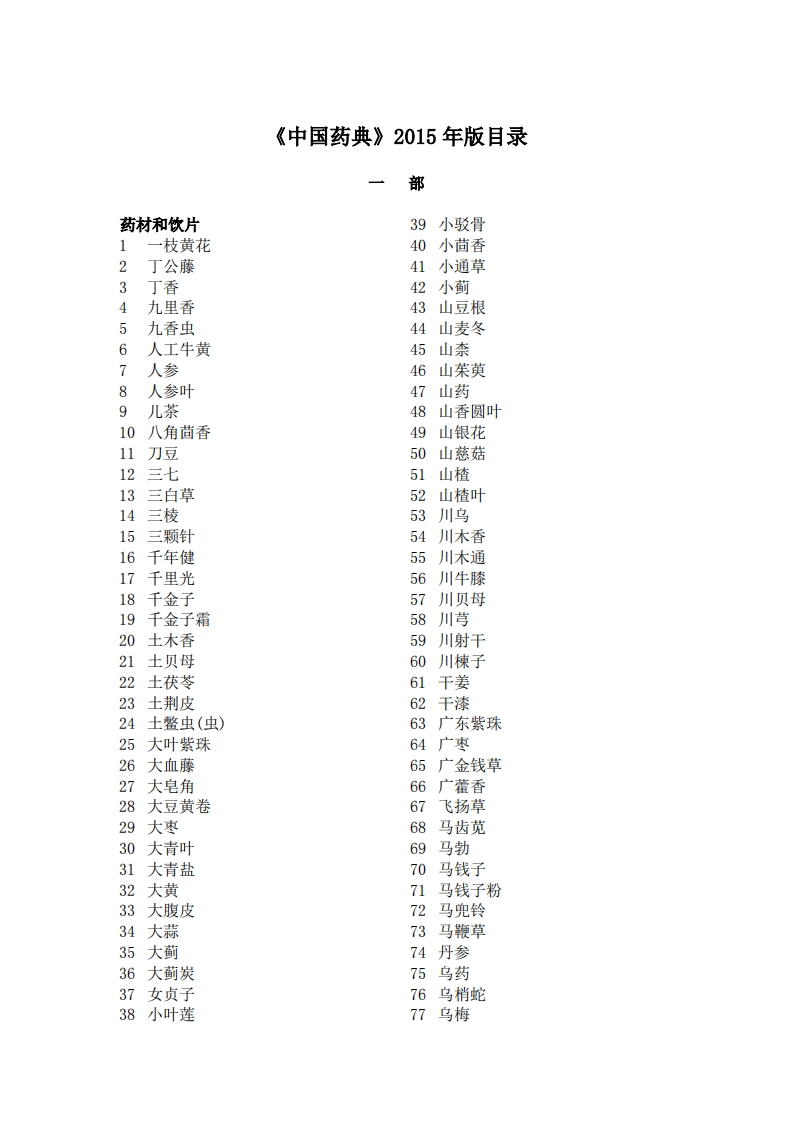 《中国药典》2015年版目录一部药材和饮片39小驳骨1一枝黄花40小茴香丁公藤41小通草3丁香42小蓟4九里香43山豆根九香虫44山麦冬6人工牛黄45山柰人参46山茱萸8人参叶47山药9儿茶48山香圆叶10八角茴香49山银花11刀豆50山慈菇12三七51山楂13三白草52山楂叶14三棱53川乌15三颗针54川木香16千年健55川木通17千里光56川牛膝18千金子57川贝母19千金子霜58川芎20土木香59川射干21土贝母60川棟子22土茯苓61千姜23土荆皮62干漆24土整虫(虫)63广东紫珠25大叶紫珠64广枣26大血藤65广金钱草27大皂角66广藿香28大豆黄卷67飞扬草29大枣68马齿苋30大青叶69马勃31大青盐70马钱子32大黄71马钱子粉33大腹皮72马兜铃34大蒜73马鞭草35大蓟74丹参36大蓟炭75乌药37女贞子76乌梢蛇38小叶莲77鸟梅