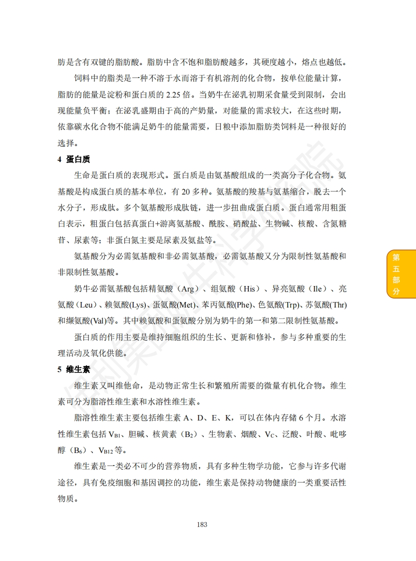 第五部分奶牛营养管理第一章奶牛饲料的营养价值及其作用一营养物质营养物质是指能够满足动物维持,生长和繁殖代谢需要的所有化学物质,是生命的必须成分。针对奶牛养殖而言获取牛奶是主要目的,奶牛只有满足自身维持需要才能提供产奶需要。奶牛的主要营养来自饲料,饲料中的营养物质包括水、碳水化合物、蛋白质、脂类、矿物质和维生素。1水水是身体的主要组成成分,几乎参与所有的化学反应包括体温调节,运输营养物质,润滑作用,维持细胞形态等。水的需要量与奶牛体重、干物质采食量、饲料构成、产奶量和环境有关,动物所需要的水由饲料和饮水提供,奶牛日粮含水量高会造成饲料发霉变质,并影响到奶牛健康状况,所以给奶牛一定要提供干净的水。2碳水化合物日粮中近70%由碳水化合物组成,在植物性日粮中,淀粉和纤维是含量最高的两种多糖,淀粉大量存在于谷物、块茎中,纤维素大量存在于粗饲料中。NRC(2001)将碳水化合物分为纤维性碳水化合物(FC)和非纤维性碳水化合物(NFC)。NFC包括有机酸、糖、淀粉、果糖和果聚糖等,FC包括纤维素、半纤维素和木质素。其中NFC在奶牛瘤胃中能快速降解,而FC中的半纤维素缓慢发酵,纤维素只能部分发酵,木质素不能发酵。碳水化合物是奶牛最重要的能量来源,是牛奶中脂肪和乳糖合成的前体物质。FC可以维持反刍和乳脂,NFC可提高日粮能量并决定菌体蛋白量,所以维持饲料中FC和NFC的平衡具有至关重要的作用。3脂类脂肪是动、植物体的组成成分,是一类高能物质。脂肪主要成分是甘油三酯。脂肪分为饱和脂肪和不饱和脂肪。饱和脂肪结构中不含双键的脂肪酸。不饱和脂182