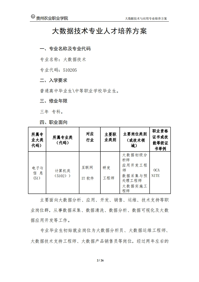 大数据技术专业人才培养方案.pdf20240313161609348072@abc4个月前发布关注私信1.18MB27页047大数据技术专业人才培养方案.pdf20240313161609此内容为付费资源,请付费后查看¥11¥22黄金会员免费钻石会员免费立即购买您当前未登录!建议登陆后购买,可保存购买订单付费资源 第1页 / 共27页 第2页 / 共27页 试读已结束,还剩25页,您可下载完整版后进行离线阅读 THE END毕业设计 文本预览 青炒袭紫俄紫?院GUIZHOU VOCATIONAL COLLEGE OF AGRICULTURE大数据技术专业人才培养方案(适用于2022级全日制在校生)专业名称大数据技术专业代码510205所属系部信息工程系2021年3月19日1/26 查看更多 收起部分 喜欢就支持一下吧收藏