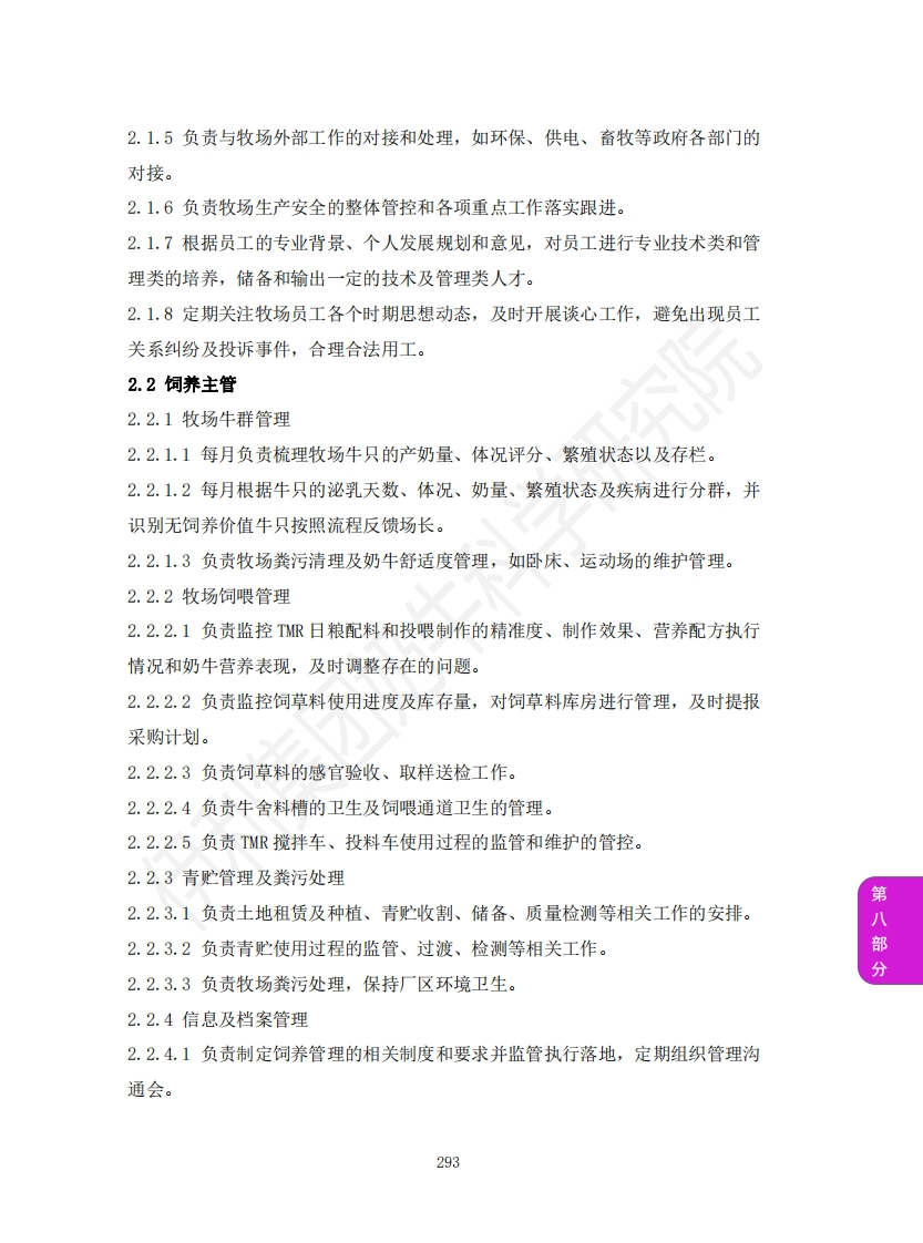 第八部分牧场绩效及财务管理第一章牧场组织架构及岗位职责1.牧场组织架构牧场内的工作繁多复杂,良好的牧场运营管理离不开牧场团队工作的高效率工作,牧场管理的最大困难是人员的管理,完善合理的组织架构是牧场实现高效管理的基础。根据牧场生产的不同模块,牧场应具备主要的组织架构如图8.1.1所示:场长饲养组繁育组保健组挤奶组犊牛组设备组后勤组主管主管主管档案员TR制作工主管主管主管主管电工绩效员接产员饲喂工育种员保健员挤奶工维修工保管员饲养员清粪工水暖工会计、门卫食堂以上组织架构中的人员配备可根据牧场规模大小适当调整,对于规模较小的牧场,繁育组和保健组的主管和员工可适当进行合并。2岗位职责2.1场长2.1.1负责牧场年度、月度生产计划及目标、成本、效益的执行落实,把控全年各项费用预算的制定和监控。2.1.2负责定期组织召开牧场经营分析会,对重点工作计划及完成情况进行总结评估,结合绩效考评等激励手段,全年推进牧场重点工作完成。2.1.3负责制定和完善牧场各项规章制度,如奖罚制度、采购流程、财务制度、考勤制度、设备维保制度、各项工作流程和标准等,监督各项制度的执行落地。2.1.4负责各部门之间工作的协调和配合以及人员管理。292