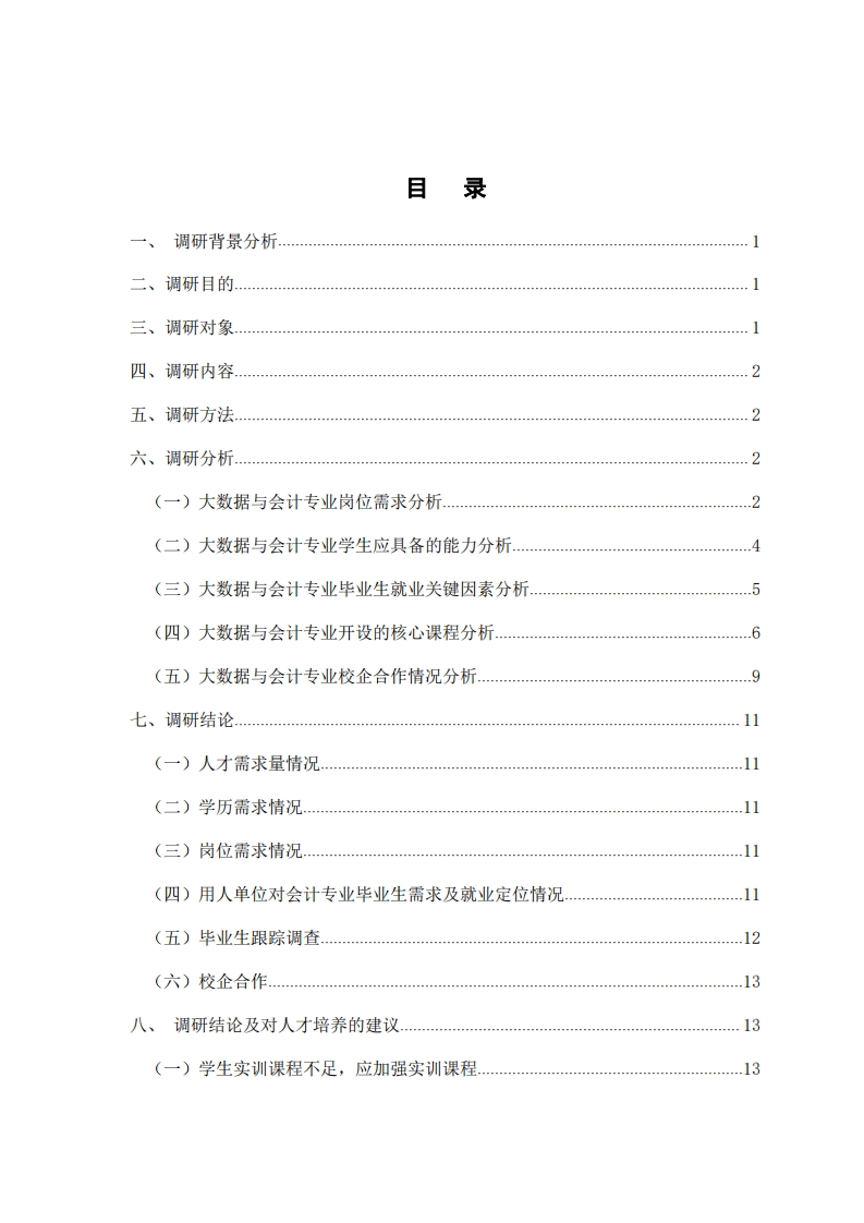 大数据与会计专业人才调研报告348072@abc4个月前发布关注私信0.65MB23页045大数据与会计专业人才调研报告此内容为付费资源,请付费后查看¥11¥22黄金会员免费钻石会员免费立即购买您当前未登录!建议登陆后购买,可保存购买订单付费资源 第1页 / 共23页 第2页 / 共23页 试读已结束,还剩21页,您可下载完整版后进行离线阅读 THE END毕业设计 文本预览 中国人寿保伦职业学饩CHINA LIFEINSURANCE PROFESSIONAL COLLEGE保险职业学院人才培养调研报告大数据与会计专业(诚鑫订单专业名称班)所在系院财经商贸学院教研室财会教研室院系审核傅航教务处审核饶晓波制定时间2021年8月 查看更多 收起部分 喜欢就支持一下吧收藏