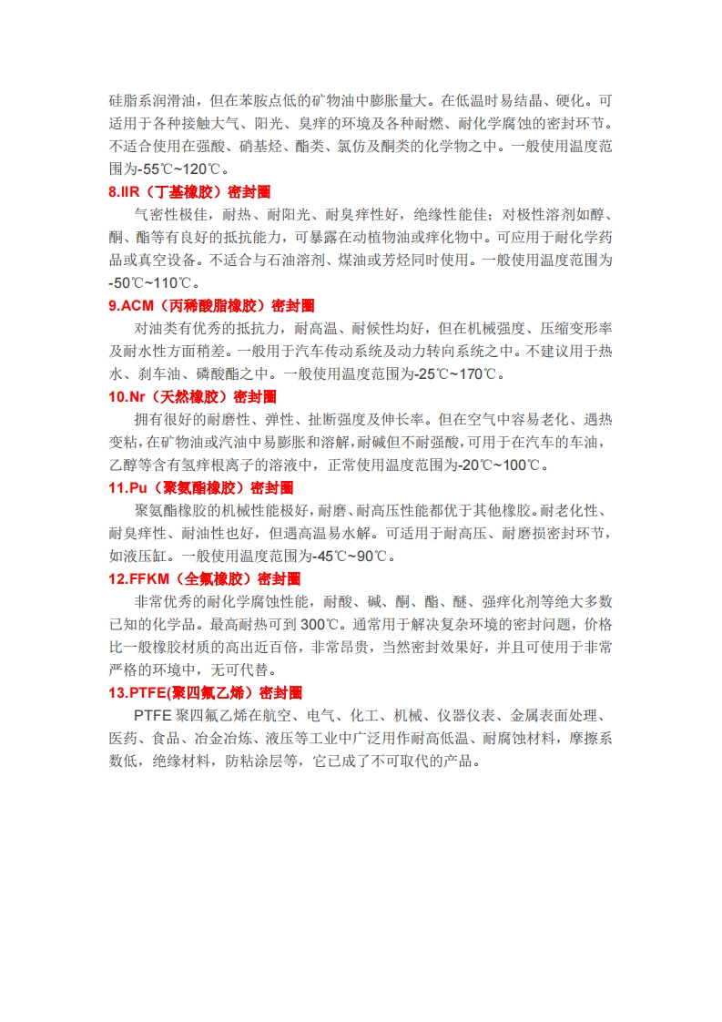 O型圈材质分类对照解析O型密封圈主要用于静密封和往复运动密封。用于旋转运动密封时,仅限于低速回转密封装置。O型密封圈一般安装在外圆或内圆上截面为矩形的沟槽内起密封作用。O型密封圈在耐油、酸碱、磨、化学侵蚀等环境依然起到良好密封、减震作用。因此,O型密封圈是液压与气压传动系统中使用最广泛的一种密封件。1.NBR(丁氰橡胶)密封圖应用于石油系液压油、甘醇系液压油、汽油、水、硅润滑脂、硅油等多种介质中使用。是目前用途最为广泛、成本最低的橡胶密封材料。不适用于极性溶剂,如酮类、臭痒、硝基烃、MEK与氯仿。正常使用温度范围为一40℃~120℃。2.HNBR(氢化丁氰橡胶)密封圈具有良好的抗腐蚀、抗撕裂和抗压缩变形等特性,耐臭痒、耐阳光、耐油性等较好。比丁氰橡胶有更佳的抗磨性。适用在洗涤机械、汽车发动机系统和新型环制冷系统中。不适合使用于醇类、酯类和芳香族的溶剂中。正常使用温度范围为-40℃~150℃。3.SL(硅橡胶)密封圈具有优秀的耐热、耐寒、耐臭痒、抗大气老化等性能。有良好的绝缘性。但是抗拉强度比一般橡胶差,并且不具耐油性。适用于家用电热水器、电熨斗、微波炉等家电产品,还适用于多种和人体皮肤有间接接触的用品,如水壶、饮水机等。不建议在大部分浓缩溶剂、油品、浓酸和氢痒化钠中使用。正常使用温度范围为-55℃-250℃。4.VTO(氟素橡胶)密封圈耐高温性优于硅橡胶,有优秀的耐候性、耐臭痒性和耐化学性,但耐寒性不佳。对于多数油品、溶剂都具有抵抗能力,尤其是抗酸类、脂族烃及动植物油。可用于柴油发动机、燃料系统及化工厂的密封需求。不适合使用在酮类、低分子量的酯类及含硝的混合物。正常使用温度范围为-20℃~220℃。5.FLS(氟硅橡胶)密封圈它的性能兼有氟素橡胶及硅橡胶的优点,在耐油、耐溶剂、耐燃料油及耐高低方面的温性均佳。能抵抗含痒的化合物、含芳香烃的溶剂及含氯的溶剂的侵蚀。可用于航空航天及军事用途。不适合暴露于酮类及刹车油中。一般使用温度范围为-50℃-200℃。6.EPDM(三元乙丙橡胶)密封圈有很好的耐候性、耐臭痒性、耐水性和耐化学性。适用于醇类及酮类,还可用于高温的水蒸气环境的密封。适用在卫浴设备、汽车散热器及汽车刹车系统中。不适合用在食品用途或是暴露于矿物油之中。一般使用温度范围为-55℃~150℃。7.CR(氯丁橡胶)密封圈耐阳光、耐天候性能极佳。可用在二氯二氟甲烷和氨等制冷剂,耐稀酸、耐