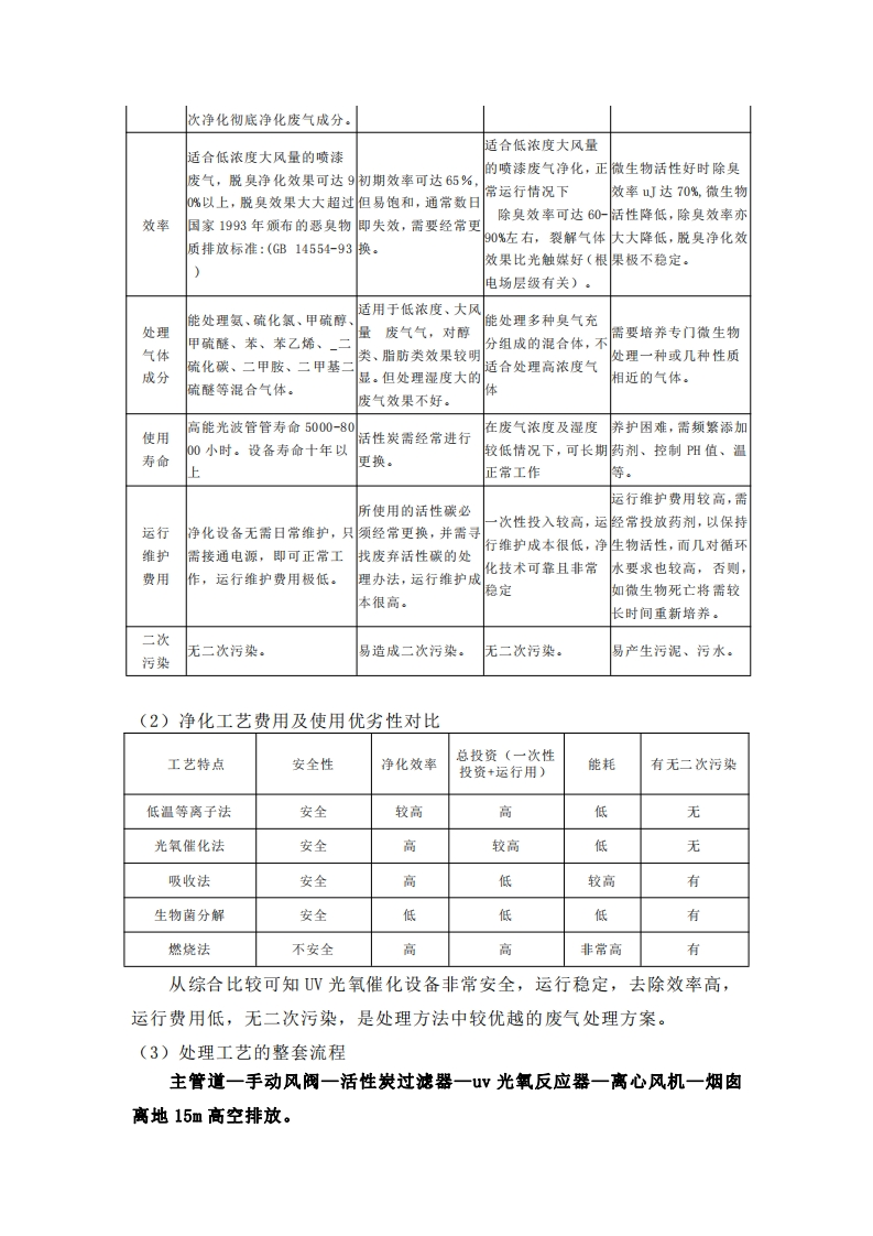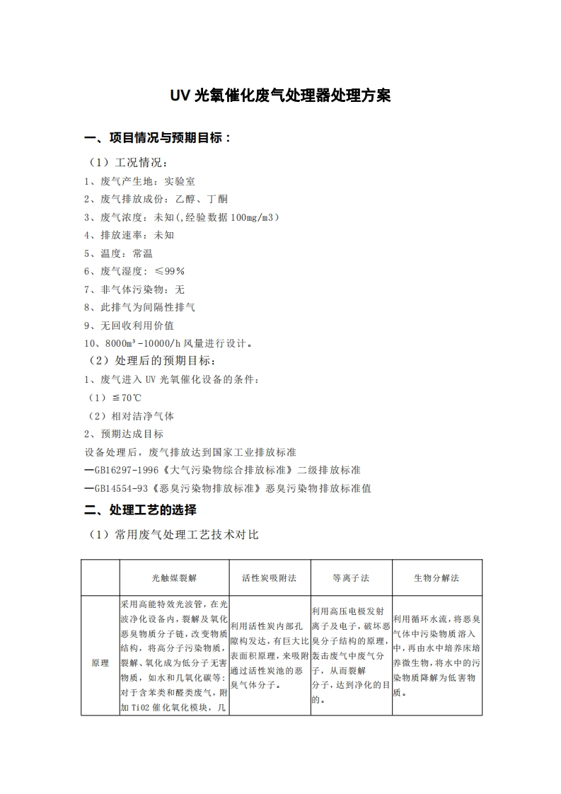 UV光氧催化废气处理器处理方案一、项目情况与预期目标:(1)工况情况:1、废气产生地:实验室2、废气排放成份:乙醇、丁酮3、废气浓度:未知(,经验数据100mg/m3)4、排放速率:未知5、温度:常温6、废气湿度:≤99%7、非气体污染物:无8、此排气为间隔性排气9、无回收利用价值10、8000m3-10000/h风量进行设计。(2)处理后的预期目标:1、废气进入V光氧催化设备的条件:(1)≤70℃(2)相对洁净气体2、预期达成目标设备处理后,废气排放达到国家工业排放标准一GB16297-1996《大气污染物综合排放标准》二级排放标准一GB14554-93《恶臭污染物排放标准》恶臭污染物排放标准值二、处理工艺的选择(1)常用废气处理工艺技术对比光触媒裂解活性炭吸附法等离子法生物分解法采用高能特效光波管,在光利用高压电极发射波净化设备内,裂解及氧化利用循环水流,将恶利用活性炭内部孔离子及电子,破坏恶恶臭物质分子链,改变物质气体中污染物质溶入结构,将高分子污染物质,隙构发达,有巨大比臭分子结构的原理,中,再由水中培养床培原理裂解、氧化成为低分子无害表面积原理,来吸附废击废气中废气分养微生物,将水中的污通过活性炭池的恶物质,如水和几氧化碳等:子,从而裂解染物质降解为低害物臭气体分子。分子,达到净化的目对于含苯类和醛类废气,附质。的。加Ti02催化氧化模块,几