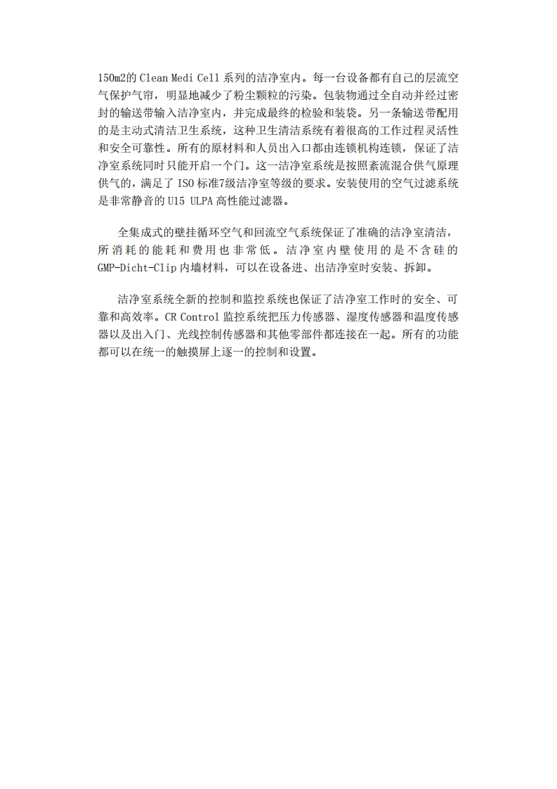 不给粉尘颗粒任何机会-一利用洁净室提高质量水平洁净室明显地提高了某瑞士药品包装生产厂的质量水平。这个洁净室中的13台药品包装设备都在层流保护气流的保护下进行包装,没有给粉尘颗粒污染物留下一丝一毫的污染可能性。洁净室条件下的连续性卫生包装是为医药产品领域用户提供产品的基本前提,也是包装技术对重要药品品牌的有利保障。减少包装生产环境中的颗粒物含量能够明显降低交叉污染的可能性和包装物的残留细菌数量。瑞士Kreuzlingen市的Kunststoff药品包装厂新建了一条洁净室包装生产线,l3台药品包装设备都在洁净室中。这一洁净室设备扩建计划大大提高了该厂的生产过程可靠性和安全性。正如公司的技术负责人Marce1 Fetzer先生所说的那样:“在使用了洁净室技术之后,塑料包装的质量有了明显的提高。废品率明显下降,同时也明显提高了包装产能。尤其是在药品生产领域中,我们必须为医药产品生产领域中的用户提供最高质量等级的产品。在新的洁净室包装线投产之后,可以肯定的说:我们的质量水平又上了一个新台阶。”这里的注塑和吹塑是高精度的复杂工艺技术过程,各个工步之间必须准确的密切衔接、协调匹配。在洁净室环境下的注塑和吹塑从技术上满足了这些要求。这家瑞士企业把这一洁净室技术投资合同委托给了洁净室技术专家Schil1ing工程技术公司。复杂的洁净室系统:吹塑机,自动化设备,检验回转台等各有自己的层流空气保护气帘。物资的输入都是经封闭的输送带自动进入洁净室内的高效的生产过程在新建的洁净室生产线中,12台注塑机和吹塑机都安装在外墙面积