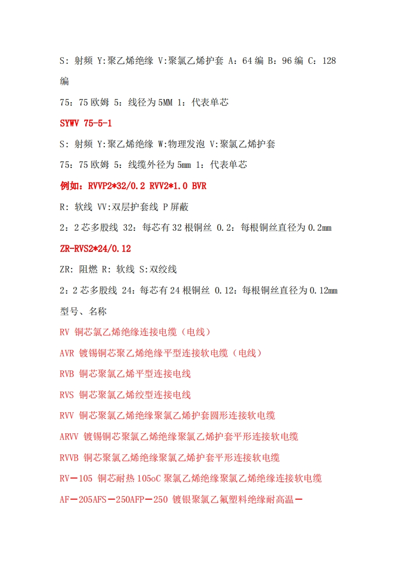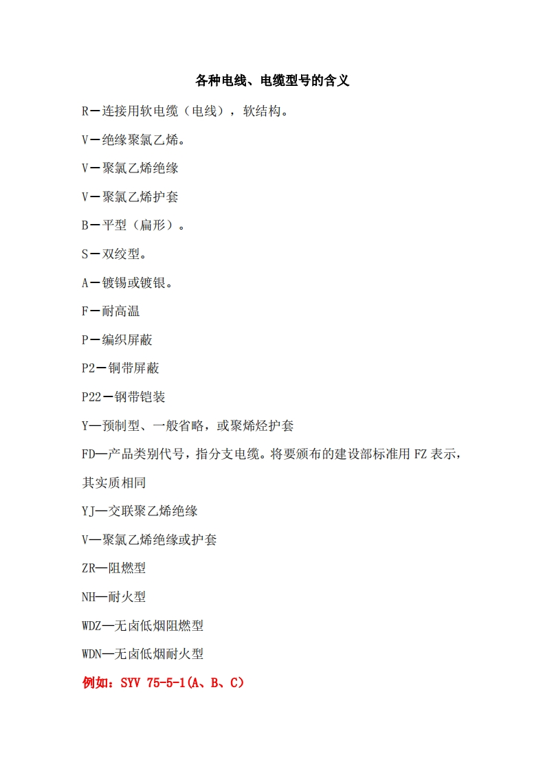 各种电线、电缆型号的含义R一连接用软电缆(电线),软结构。V一绝缘聚氯乙烯。V一聚氯乙烯绝缘V一聚氯乙烯护套B一平型(扁形)。S一双绞型。A一镀锡或镀银。F一耐高温P一编织屏蔽P2一铜带屏蔽P22-钢带铠装Y一预制型、一般省略,或聚烯烃护套FD一产品类别代号,指分支电缆。将要颁布的建设部标准用FZ表示,其实质相同YJ一交联聚乙烯绝缘V一聚氯乙烯绝缘或护套ZR一阻燃型N一耐火型DZ一无卤低烟阻燃型DN一无卤低烟耐火型例如:SYW75-5-1A、B、C)
