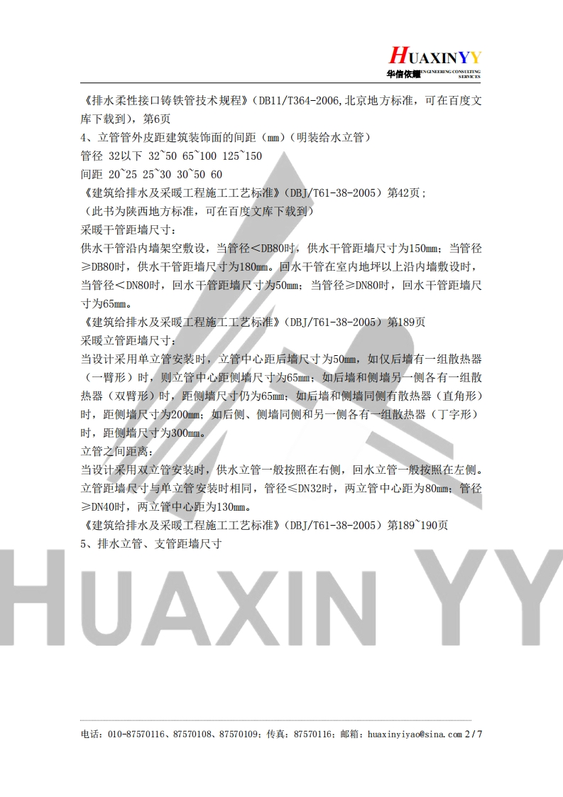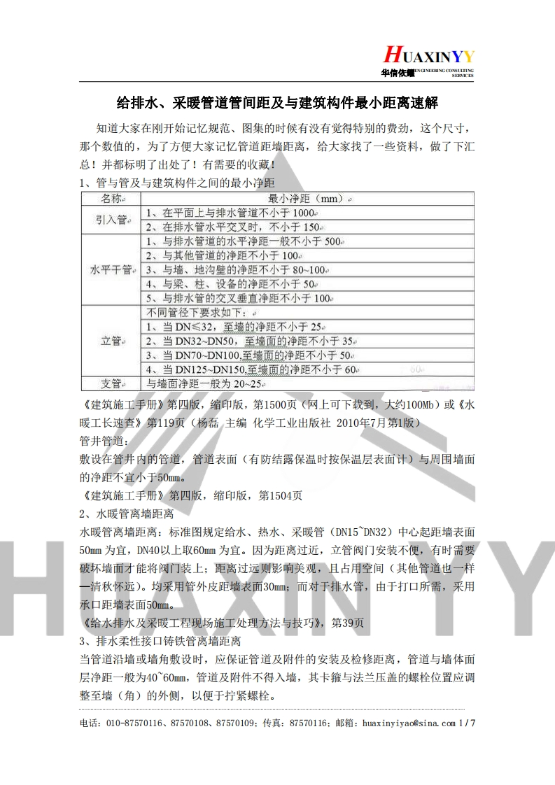 HUAXINYY给排水、采暖管道管间距及与建筑构件最小距离速解知道大家在刚开始记忆规范、图集的时候有没有觉得特别的费劲,这个尺寸,那个数值的,为了方便大家记忆管道距墙距离,给大家找了一些资料,做了下汇总!并都标明了出处了!有需要的收藏!1、管与管及与建筑构件之间的最小净距名称和最小净距(mm)e引入管。1、在平面上与排水管道不小于10002、在排水管水平交叉时,不小于1501、与排水管道的水平净距一般不小于5002、与其他管道的净距不小于100水平干管3、与墙、地沟壁的净距不小于80~1004、与梁、柱、设备的净距不小于505、与排水管的交叉垂直净距不小于100不同管径下要求如下:1、当DN≤32,至墙的净距不小于25。立管2、当DN32-~DN50,至墙面的净距不小于353、当DN70~DN100,至墙面的净距不小于50e4、当DN125DN150,至墙面的净距不小于60支管与墙面净距一般为2025《建筑施工手册》第四版,缩印版,第1500页(网上可下载到,大约100Mb)或《水暖工长速查》第119页(杨磊主编化学工业出版社2010年7月第1版)管井管道:敷设在管井内的管道,管道表面(有防结露保温时按保温层表面计)与周围墙面的净距不宜小于50mm。《建筑施工手册》第四版,缩印版,第1504页2、水暖管离墙距离水暖管离墙距离:标准图规定给水、热水、采暖管(DN15DN32)中心起距墙表面50mm为宜,DN40以上取60mm为宜。因为距离过近,立管阀门安装不便,有时需要破坏墙面才能将阀门装上:距离过远则影响美观,且占用空间(其他管道也一样一清秋怀远)。均采用管外皮距墙表面30mm:而对于排水管,由于打口所需,采用承口距墙表面50mm。《给水排水及采暖工程现场施工处理方法与技巧》,第39页3、排水柔性接口铸铁管离墙距离当管道沿墙或墙角敷设时,应保证管道及附件的安装及检修距离,管道与墙体面层净距一般为4060mm,管道及附件不得入墙,其卡箍与法兰压盖的螺栓位置应调整至墙(角)的外侧,以便于拧紧螺栓。电话:010-87570116、87570108、87570109:传真:87570116:邮箱:huaxinyiyao@sina.com1/7