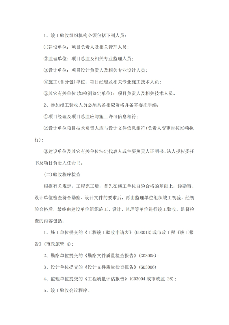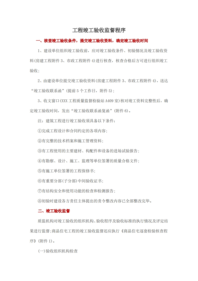 工程竣工验收监督程序一、核查竣工验收条件,提交竣工验收资料,确定竣工验收时间1、建设单位组织竣工验收前,应对竣工验收条件、初验情况及竣工验收资料(房建工程附件3、市政工程附件4)进行核查,核查合格后方可进行组织竣工验收2、由建设单位提交竣工验收资料(房建工程附件3、市政工程附件4),送达“竣工验收联系函”(提前5个工作日,附件5):3、收文窗口(XXX工程质量监督检验站A409室)核对竣工资料完整性后,确定竣工验收时间,发出“竣工验收联系函复函”(附件6)。注:建筑工程进行竣工验收须具备以下条件:①完成工程设计和合同约定的各项内容:②有完整的技术档案和施工管理资料:③有工程使用的主要建材、构配件和设备的进场试验报告:④有勘察、设计、施工、监理等单位签署的质量合格文件:⑤有施工单位签署的工程保修书:⑥有重要分部(子分部)中间验收证书:⑦有结构安全和使用功能的检查和检测报告:⑧初验时建设各方责任主体提出的责令整改内容已全部整改完毕。二、竣工验收监督质监机构对竣工验收的组织机构、验收程序及验收标准的执行情况及评定结果进行监督:商品住宅工程的竣工验收监督还应执行《商品住宅逐套检验核查程序》(附件1)。(一)验收组织机构检查