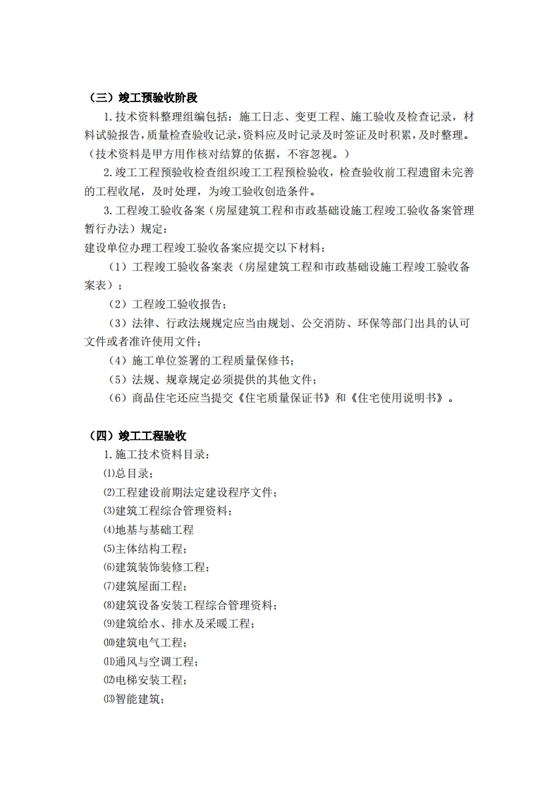 工程资料名录对于土建资料员新手来说,了解熟悉每一个工程的施工工序非常重要和关键,也是一个合格的土建资料员的必备的素质。因为所有的资料都是紧跟着每一道施工工序产生的。(一)施工准备1、技术准备:承包合同,工程预算,施工组织设计,图纸会审。2、现场准备:三通一平,工程定位放线及复核,施工许可证申报,质监申报,临时占用道路申报,现场文明施工围蔽,临施建造,材料、机具组织进场。3、组织准备:组织劳动力进场:(1)确定施工及各工作工序,搭接次序。(2)组织分段平衡流水,交代作业计划。(3)组织新进场工人进行安全教育及考核。(二)施工阶段1、质量控制:贯彻施工组织设计,制度措施,监督执行规范、规程,工艺标准,贯彻工程质量验收标准,切实执行质量检查和质量验收,做好工序交接检查验收,隐蔽工程检查验收,防渗漏试水检查验收,变更工程签证,控制材料进场质量,加强施工复核,组织工程质量定期及不定期的质量检查。2、安全控制:贯彻以“预防为主”的安全生产方针,控制五个安全因素(人、材料、机械、方法、环境),其中包括:施工作业安排,用电与防火安全,落实层级安全生产责任制,贯彻安全生产奖惩制度措施,落实安全生产检查制度,组织安全技术交底及安全教育学习。3、进度控制:根据合同工期及施工组织设计,分阶段编制施工进度作业计划,及时检查计划进度,及时调整计划,协调土建与其他专业施工的协作配合。4、成本控制:及时做好经济签证,贯彻降低成本措施,优化进度计划,优化劳动力,严格控制材料进场数量及质量,材料发放实行限额领料,加强施工放线复核,做到事前控制质量,减少事后返工损失,掌握经济索赔技巧及签证索赔策略,减少经济损失。5、文明施工施工现场场容管理。6、现场料具管理包括:生产工具(做好发放与回收)、现场材料(施工平面布置图分类堆放并加标颜色),周转料(分类堆放)。