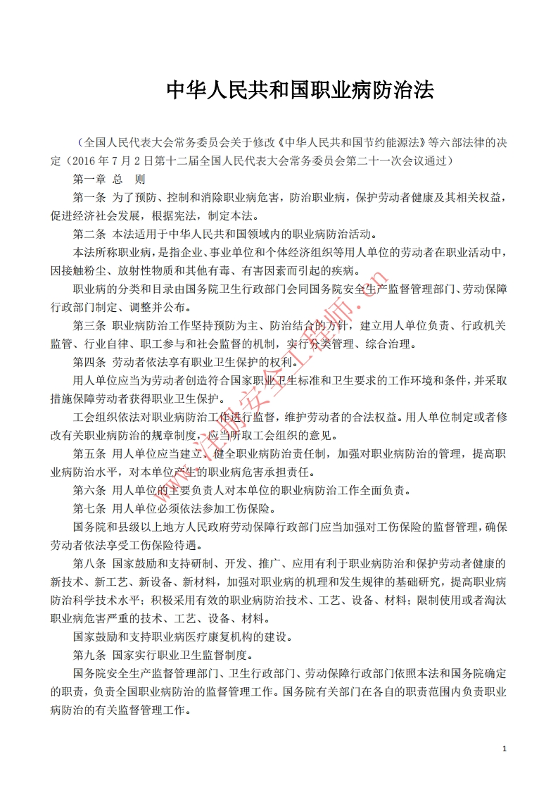 中华人民共和国职业病防治法(全国人民代表大会常务委员会关于修改《中华人民共和国节约能源法》等六部法律的决定(2016年7月2日第十二届全国人民代表大会常务委员会第二十一次会议通过)第一章总则第一条为了预防、控制和消除职业病危害,防治职业病,保护劳动者健康及其相关权益,促进经济社会发展,根据宪法,制定本法。第二条本法适用于中华人民共和国领域内的职业病防治活动。本法所称职业病,是指企业、事业单位和个体经济组织等用人单位的劳动者在职业活动中,因接触粉尘、放射性物质和其他有毒、有害因素而引起的疾病。职业病的分类和目录由国务院卫生行政部门会同国务院安全生产监督管理部门、劳动保障行政部门制定、调整并公布。第三条职业病防治工作坚持预防为主、防治结合的方针,建立用人单位负责、行政机关监管、行业自律、职工参与和社会监督的机制,实行分类管理、综合治理。第四条劳动者依法享有职业卫生保护的权利。用人单位应当为劳动者创造符合国家职业见生标准和卫生要求的工作环境和条件,并采取措施保障劳动者获得职业卫生保护。工会组织依法对职业病防治工俺进行监督,维护劳动者的合法权益。用人单位制定或者修改有关职业病防治的规章制度,应鲁所取工会组织的意见。第五条用人单位应当建立健全职业病防治责任制,加强对职业病防治的管理,提高职业病防治水平,对本单位产生的职业病危害承担责任。第六条用人单位的主要负责人对本单位的职业病防治工作全面负责。第七条用人单位必须依法参加工伤保险。国务院和县级以上地方人民政府劳动保障行政部门应当加强对工伤保险的监督管理,确保劳动者依法享受工伤保险待遇。第八条国家鼓励和支持研制、开发、推广、应用有利于职业病防治和保护劳动者健康的新技术、新工艺、新设备、新材料,加强对职业病的机理和发生规律的基础研究,提高职业病防治科学技术水平:积极采用有效的职业病防治技术、工艺、设备、材料:限制使用或者淘汰职业病危害严重的技术、工艺、设备、材料。国家鼓励和支持职业病医疗康复机构的建设。第九条国家实行职业卫生监督制度。国务院安全生产监督管理部门、卫生行政部门、劳动保障行政部门依照本法和国务院确定的职责,负责全国职业病防治的监督管理工作。国务院有关部门在各自的职责范围内负责职业病防治的有关监督管理工作。