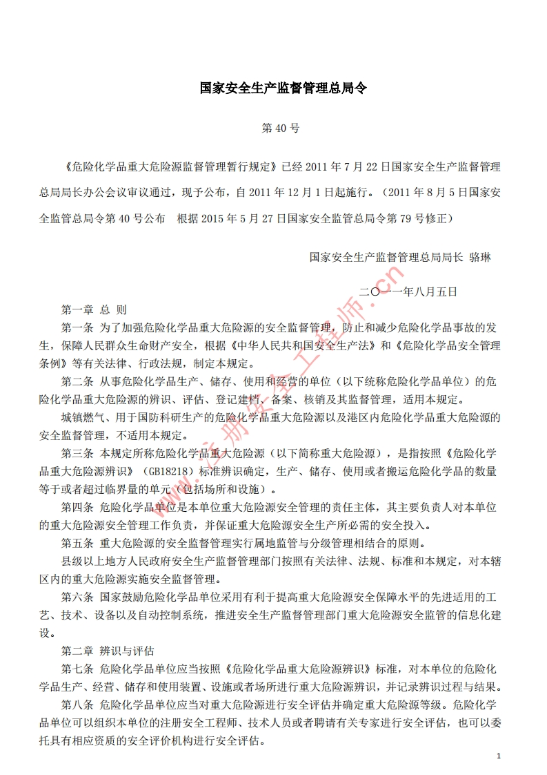国家安全生产监督管理总局令第40号《危险化学品重大危险源监督管理暂行规定》已经2011年7月22日国家安全生产监督管理总局局长办公会议审议通过,现予公布,自2011年12月1日起施行。(2011年8月5日国家安全监管总局令第40号公布根据2015年5月27日国家安全监管总局令第79号修正)国家安全生产监督管理总局局长骆琳年八月五日第一章总则第一条为了加强危险化学品重大危险源的安全监督管理,防止和减少危险化学品事故的发生,保障人民群众生命财产安全,根据《中华人民共和国安全生产法》和《危险化学品安全管理条例》等有关法律、行政法规,制定本规定。第二条从事危险化学品生产、储存、使用和经营的单位(以下统称危险化学品单位)的危险化学品重大危险源的辨识、评估、登记建档备案、核销及其监督管理,适用本规定。城镇燃气、用于国防科研生产的危险化学品重大危险源以及港区内危险化学品重大危险源的安全监督管理,不适用本规定。第三条本规定所称危险化学品重大危险源(以下简称重大危险源),是指按照《危险化学品重大危险源辨识》(GB18218)标准辨识确定,生产、储存、使用或者搬运危险化学品的数量等于或者超过临界量的单元(包括场所和设施)。第四条危险化学品单位是本单位重大危险源安全管理的责任主体,其主要负责人对本单位的重大危险源安全管理工作负责,并保证重大危险源安全生产所必需的安全投入。第五条重大危险源的安全监督管理实行属地监管与分级管理相结合的原则。县级以上地方人民政府安全生产监督管理部门按照有关法律、法规、标准和本规定,对本辖区内的重大危险源实施安全监督管理。第六条国家鼓励危险化学品单位采用有利于提高重大危险源安全保障水平的先进适用的工艺、技术、设备以及自动控制系统,推进安全生产监督管理部门重大危险源安全监管的信息化建设。第二章辨识与评估第七条危险化学品单位应当按照《危险化学品重大危险源辨识》标准,对本单位的危险化学品生产、经营、储存和使用装置、设施或者场所进行重大危险源辨识,并记录辨识过程与结果。第八条危险化学品单位应当对重大危险源进行安全评估并确定重大危险源等级。危险化学品单位可以组织本单位的注册安全工程师、技术人员或者聘请有关专家进行安全评估,也可以委托具有相应资质的安全评价机构进行安全评估。