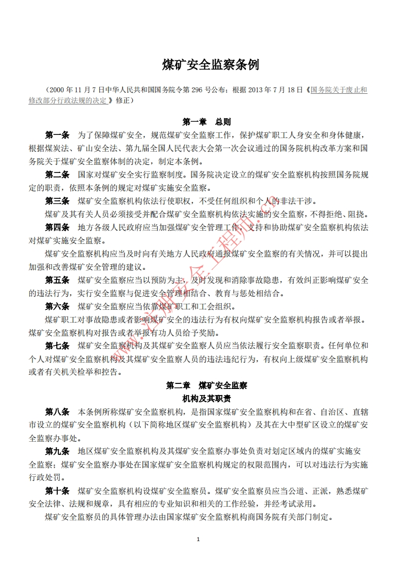 煤矿安全监察条例(2000年11月7日中华人民共和国国务院令第296号公布:根据2013年7月18日《国务院关于废止和修改部分行政法规的决定》修正)第一章总则第一条为了保障煤矿安全,规范煤矿安全监察工作,保护煤矿职工人身安全和身体健康,根据煤炭法、矿山安全法、第九届全国人民代表大会第一次会议通过的国务院机构改革方案和国务院关于煤矿安全监察体制的决定,制定本条例。第二条国家对煤矿安全实行监察制度。国务院决定设立的煤矿安全监察机构按照国务院规定的职责,依照本条例的规定对煤矿实施安全监察。第三条煤矿安全监察机构依法行使职权,不受任何组织和个人的非法干涉。煤矿及其有关人员必须接受并配合煤矿安全监察机构依法实施的安全监察,不得拒绝、阻挠。第四条地方各级人民政府应当加强煤矿安全管理工作支持和协助煤矿安全监察机构依法对煤矿实施安全监察。煤矿安全监察机构应当及时向有关地方人民政府通报煤矿安全监察的有关情况,并可以提出加强和改善煤矿安全管理的建议。第五条煤矿安全监察应当以预防为主,及时发现和消除事故隐患,有效纠正影响煤矿安全的违法行为,实行安全监察与促进安金管理相结合、教育与惩处相结合。第六条煤矿安全监察应当依靠煤职工和工会组织。煤矿职工对事故隐患或者影响煤矿安全的违法行为有权向煤矿安全监察机构报告或者举报。煤矿安全监察机构对报告或者举报有功人员给予奖励。第七条煤利矿安全监察机构及其煤矿安全监察人员应当依法履行安全监察职责。任何单位和个人对煤矿安全监察机构汲其煤矿安全监察人员的违法违纪行为,有权向上级煤矿安全监察机构或者有关机关检举和控告。第二章煤矿安全监察机构及其职责第八条本条例所称煤矿安全监察机构,是指国家煤矿安全监察机构和在省、自治区、直辖市设立的煤矿安全监察机构(以下简称地区煤矿安全监察机构)及其在大中型矿区设立的煤矿安全监察办事处。第九条地区煤矿安全监察机构及其煤矿安全监察办事处负责对划定区域内的煤矿实施安全监察:煤矿安全监察办事处在国家煤矿安全监察机构规定的权限范围内,可以对违法行为实施行政处罚。第十条煤矿安全监察机构设煤矿安全监察员。煤矿安全监察员应当公道、正派,熟悉煤矿安全法律、法规和规章,具有相应的专业知识和相关的工作经验,并经考试录用。煤矿安全监察员的具体管理办法由国家煤矿安全监察机构商国务院有关部门制定。