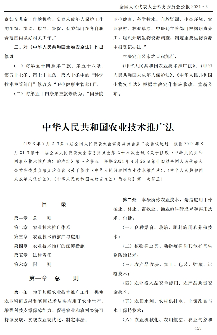 全国人民代表大会常务委员会公报2024·3责妇女儿童工作的机构,负责未成年人保护工作卫生健康、科学技术、自然资源、生态环境、农的组织、协调、指导、督促,有关部门在各自职业农村、林业草原、中医药主管部门根据职责分责范围内做好相关工作。”工,组织开展生物资源调查,制定重要生物资源三、对《中华人民共和国生物安全法》作出申报登记办法。”修改本决定自公布之日起施行。(一)将第五十四条第二款、第五十六条、《中华人民共和国农业技术推广法》、《中华第五十七条、第七十九条、第八十条中的“科学人民共和国未成年人保护法》、《中华人民共和国技术主管部门”修改为“卫生健康主管部门”。生物安全法》根据本决定作相应修改,重新公(二)将第五十四条第三款修改为:“国务院布。中华人民共和国农业技术推广法(1993年7月2日第八届全国人民代表大会常务委员会第二次会议通过根据2012年8月31日第十一届全国人民代表大会常务委员会第二十八次会议《关于修改《中华人民共和国农业技术推广法〉的决定》第一次修正根据2024年4月26日第十四届全国人民代表大会常务委员会第九次会议《关于修改〈中华人民共和国农业技术推广法》、〈中华人民共和国未成年人保护法〉、〈中华人民共和国生物安全法〉的决定》第二次修正)第二条本法所称农业技术,是指应用于种目录植业、林业、畜牧业、渔业的科研成果和实用技第一章总则术,包括:第二章农业技术推广体系(一)良种繁育、栽培、肥料施用和养殖技第三章农业技术的推广与应用术:第四章农业技术推广的保障措施(二)植物病虫害、动物疫病和其他有害生第五章法律责任物防治技术:第六章附则(三)农产品收获、加工、包装、贮藏、运输技术;第一章总则(四)农业投入品安全使用、农产品质量安第一条为了加强农业技术推广工作,促使全技术:农业科研成果和实用技术尽快应用于农业生产,(五)农田水利、农村供排水、土壤改良与增强科技支撑保障能力,促进农业和农村经济可水土保持技术;持续发展,实现农业现代化,制定本法。(六)农业机械化、农用航空、农业气象和-455-