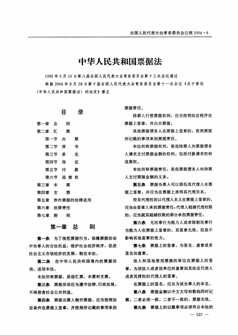 全国人民代表大会常务委员会公报2004·6中华人民共和国票据法1995年5月10日第八届全国人民代表大会常务委员会第十三次会议通过根据2004年8月28日第十届全国人民代表大会常务委员会第十一次会议《关于修改〈中华人民共和国票据法》的决定》修正票据责任。目录持票人行使票据权利,应当按照法定程序在第一章总则票据上签章,并出示票据。第二章汇8其他票据债务人在票据上签章的,按照票据第一节出票所记载的事项承担票据贵任。第二节背书本法所称票据权利,是指持票人向票据债务第三节承兑人请求支付票据金额的权利,包括付款请求权和第四节保证追索权。第五节付款本法所称票据责任,是指票据债务人向持票第六节追索权人支付票据金额的义务。第三章本票第五条票据当事人可以委托其代理人在票第四章支票据上签章,并应当在票据上表明其代理关系。第五章涉外票据的法律适用没有代理权而以代理人名义在票据上签章的,第六章法律责任应当由签章人承担票据贵任:代理人超越代理权限第七章附则的,应当就其超越权限的部分承担票据责任。第六条无民事行为能力人或者限制民事行第一章总则为能力人在票据上签章的,其签章无效,但是不第一条为了规范票据行为,保障票据活动影响其他签章的效力。中当事人的合法权益,维护社会经济秩序,促进第七条票据上的签章,为签名、盖章或者杜会主义市场经济的发展,制定本法。签名加盖章。第二条在中华人民共和国境内的票据活法人和其他使用票据的单位在票据上的签动,适用本法。章,为该法人或者该单位的盖章加其法定代表人本法所称票据,是指汇票、本票和支票。或者其授权的代理人的签章。第三条票据活动应当遵守法律、行政法规,在票据上的签名,应当为该当事人的本名。不得损害社会公共利益。第八条票据金额以中文大写和数码同时记第四条票据出票人制作票据,应当按照法载,二者必须一致,二者不一致的,票据无效。定条件在票据上签章,并按照所记载的事项承担第九亲票据上的记载事项必须符合本法的-527-