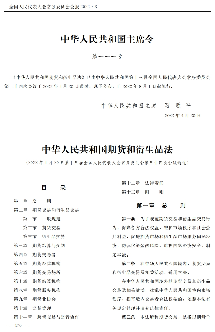 全国人民代表大会常务委员会公报2022·3中华人民共和国主席令第一一一号《中华人民共和国期货和衍生品法》已由中华人民共和国第十三届全国人民代表大会常务委员会第三十四次会议于2022年4月20日通过,现予公布,自2022年8月1日起施行。中华人民共和国主席习近平2022年4月20日中华人民共和国期货和衍生品法(2022年4月20日第十三届全国人民代表大会常务委员会第三十四次会议通过)第十二章法律责任目录第十三章附则第一章总则第一章总则第二章期货交易和衍生品交易第一节一般规定第一条为了规范期货交易和衍生品交易行第二节期货交易为,保障各方合法权益,维护市场秩序和社会公第三节衍生品交易共利益,促进期货市场和衍生品市场服务国民经第三章期货结算与交割济,防范化解金融风险,维护国家经济安全,制第四章期货交易者定本法。第五章期货经营机构第二条在中华人民共和国境内,期货交易第六章期货交易场所和衍生品交易及相关活动,适用本法。第七章期货结算机构在中华人民共和国境外的期货交易和衍生品第八章期货服务机构交易及相关活动,扰乱中华人民共和国境内市场第九章期货业协会秩序,损害境内交易者合法权益的,依照本法有第十章监督管理关规定处理并追究法律责任。第十一章跨境交易与监管协作第三条本法所称期货交易,是指以期货合-476-