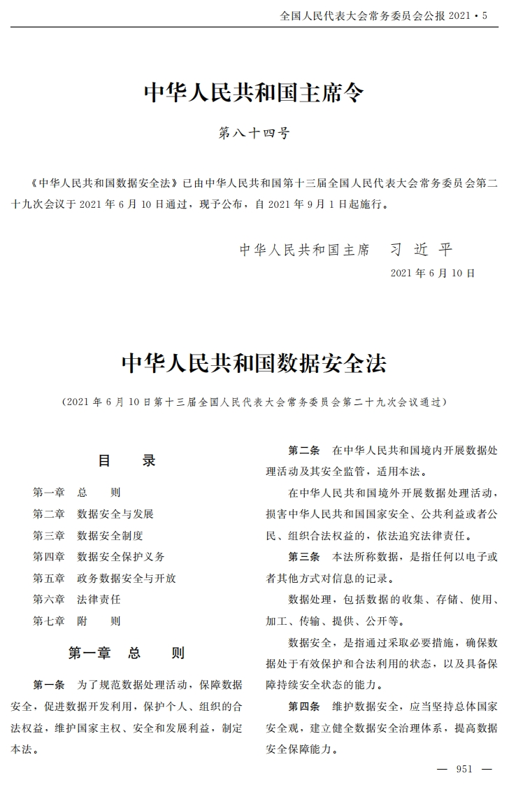 全国人民代表大会常务委员会公报2021·5中华人民共和国主席令第八十四号《中华人民共和国数据安全法》已由中华人民共和国第十三届全国人民代表大会常务委员会第二十九次会议于2021年6月10日通过,现予公布,自2021年9月1日起施行。中华人民共和国主席习近平2021年6月10日中华人民共和国数据安全法(2021年6月10日第十三届全国人民代表大会常务委员会第二十九次会议通过)第二条在中华人民共和国境内开展数据处目录理活动及其安全监管,适用本法。第一章总则在中华人民共和国境外开展数据处理活动,第二章数据安全与发展损害中华人民共和国国家安全、公共利益或者公第三章数据安全制度民、组织合法权益的,依法追究法律责任。第四章数据安全保护义务第三条本法所称数据,是指任何以电子或第五章政务数据安全与开放者其他方式对信息的记录。第六章法律责任数据处理,包括数据的收集、存储、使用、第七章附则加工、传输、提供、公开等。数据安全,是指通过采取必要措施,确保数第一章总则据处于有效保护和合法利用的状态,以及具备保第一条为了规范数据处理活动,保障数据障持续安全状态的能力。安全,促进数据开发利用,保护个人、组织的合第四条维护数据安全,应当坚持总体国家法权益,维护国家主权、安全和发展利益,制定安全观,建立健全数据安全治理体系,提高数据本法。安全保障能力。-951