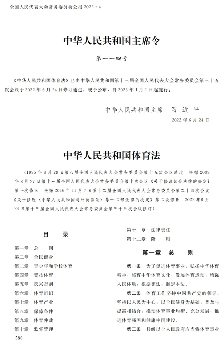 全国人民代表大会常务委员会公报2022·4中华人民共和国主席令第一一四号《中华人民共和国体育法》已由中华人民共和国第十三届全国人民代表大会常务委员会第三十五次会议于2022年6月24日修订通过,现予公布,自2023年1月1日起施行。中华人民共和国主席习近平2022年6月24日中华人民共和国体育法(1995年8月29日第八届全国人民代表大会常务委员会第十五次会议通过根据2009年8月27日第十一届全国人民代表大会常务委员会第十次会议《关于修改部分法律的决定》第一次修正根据2016年11月7日第十二届全国人民代表大会常务委员会第二十四次会议《关于修改〈中华人民共和国对外贸易法〉等十二部法律的决定》第二次修正2022年6月24日第十三届全国人民代表大会常务委员会第三十五次会议修订)第十一章法律责任目录第十二章附则第一章总则第一章总则第二章全民健身第三章青少年和学校体育第一条为了促进体育事业,弘扬中华体育第四章竞技体育精神,培育中华体育文化,发展体育运动,增强第五章反兴奋剂人民体质,根据宪法,制定本法。第六章体育组织第二条体育工作坚持中国共产党的领导,第七章体育产业坚持以人民为中心,以全民健身为基础,普及与第八章保障条件提高相结合,推动体育事业均衡、充分发展,推第九章体育仲裁进体育强国和健康中国建设。第十章监督管理第三条县级以上人民政府应当将体育事业-586