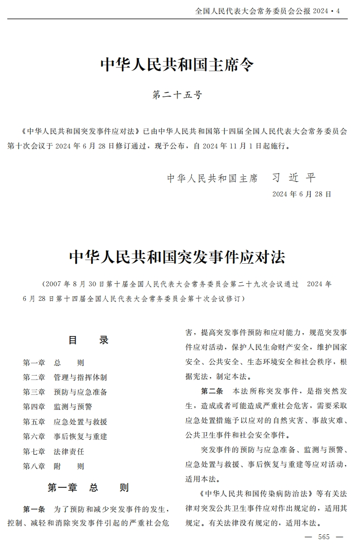 全国人民代表大会常务委员会公报2024·4中华人民共和国主席令第二十五号《中华人民共和国突发事件应对法》已由中华人民共和国第十四届全国人民代表大会常务委员会第十次会议于2024年6月28日修订通过,现予公布,自2024年11月1日起施行。中华人民共和国主席习近平2024年6月28日中华人民共和国突发事件应对法(2007年8月30日第十届全国人民代表大会常务委员会第二十九次会议通过2024年6月28日第十四届全国人民代表大会常务委员会第十次会议修订)害,提高突发事件预防和应对能力,规范突发事目录件应对活动,保护人民生命财产安全,维护国家第一章总则安全、公共安全、生态环境安全和社会秩序,根第二章管理与指挥体制据宪法,制定本法。第三章预防与应急准备第二条本法所称突发事件,是指突然发第四章监测与预警生,造成或者可能造成严重社会危害,需要采取第五章应急处置与救援应急处置措施予以应对的自然灾害、事故灾难、第六章事后恢复与重建公共卫生事件和社会安全事件。第七章法律责任突发事件的预防与应急准备、监测与预警、第八章附则应急处置与救援、事后恢复与重建等应对活动,适用本法。第一章总则《中华人民共和国传染病防治法》等有关法第一条为了预防和减少突发事件的发生,律对突发公共卫生事件应对作出规定的,适用其控制、减轻和消除突发事件引起的严重社会危规定。有关法律没有规定的,适用本法。-565-