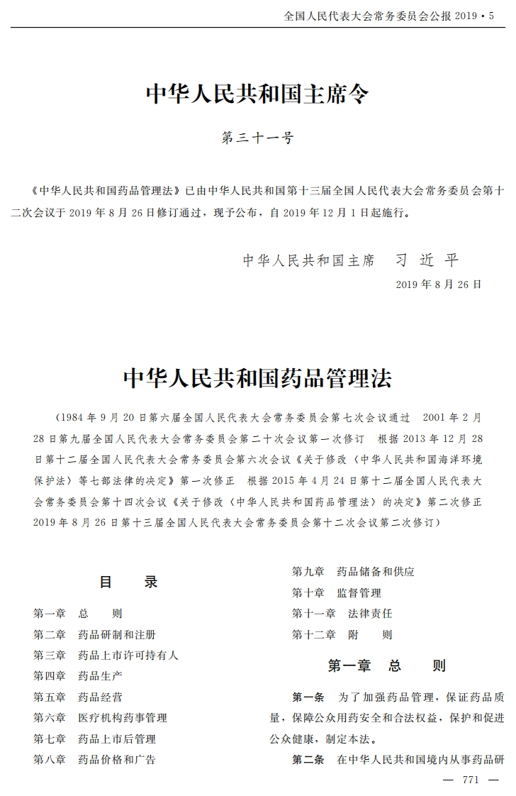 全国人民代表大会常务委员会公报2019·5中华人民共和国主席令第三十一号《中华人民共和国药品管理法》已由中华人民共和国第十三届全国人民代表大会常务委员会第十二次会议于2019年8月26日修订通过,现予公布,自2019年12月1日起施行。中华人民共和国主席习近平2019年8月26日中华人民共和国药品管理法(1984年9月20日第六届全国人民代表大会常务委员会第七次会议通过2001年2月28日第九届全国人民代表大会常务委员会第二十次会议第一次修订根据2013年12月28日第十二届全国人民代表大会常务委员会第六次会议《关于修改《中华人民共和国海洋环境保护法〉等七部法律的决定》第一次修正根据2015年4月24日第十二届全国人民代表大会常务委员会第十四次会议《关于修改(中华人民共和国药品管理法〉的决定》第二次修正2019年8月26日第十三届全国人民代表大会常务委员会第十二次会议第二次修订)第九章药品储备和供应目录第十章监督管理第一章总则第十一章法律责任第二章药品研制和注册第十二章附则第三章药品上市许可持有人第一章总则第四章药品生产第五章药品经营第一条为了加强药品管理,保证药品质第六章医疗机构药事管理量,保障公众用药安全和合法权益,保护和促进第七章药品上市后管理公众健康,制定本法。第八章药品价格和广告第二条在中华人民共和国境内从事药品研-771