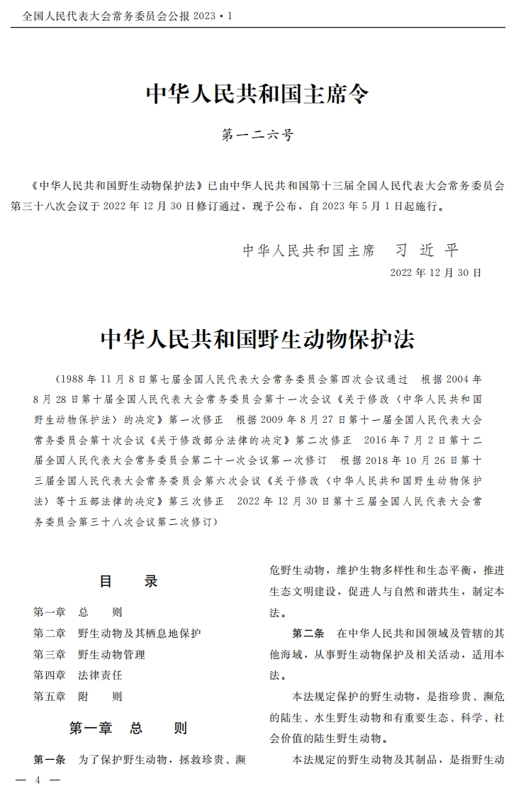 全国人民代表大会常务委员会公报2023·1中华人民共和国主席令第一二六号《中华人民共和国野生动物保护法》已由中华人民共和国第十三届全国人民代表大会常务委员会第三十八次会议于2022年12月30日修订通过,现予公布,自2023年5月1日起施行。中华人民共和国主席习近平2022年12月30日中华人民共和国野生动物保护法(1988年11月8日第七届全国人民代表大会常务委员会第四次会议通过根据2004年8月28日第十届全国人民代表大会常务委员会第十一次会议《关于修改《中华人民共和国野生动物保护法〉的决定》第一次修正根据2009年8月27日第十一届全国人民代表大会常务委员会第十次会议《关于修改部分法律的决定》第二次修正2016年7月2日第十二届全国人民代表大会常务委员会第二十一次会议第一次修订根据2018年10月26日第十三届全国人民代表大会常务委员会第六次会议《关于修改〈中华人民共和国野生动物保护法〉等十五部法律的决定》第三次修正2022年12月30日第十三届全国人民代表大会常务委员会第三十八次会议第二次修订)危野生动物,维护生物多样性和生态平衡,推进目录生态文明建设,促进人与自然和谐共生,制定本第一章总则法。第二章野生动物及其栖息地保护第二条在中华人民共和国领域及管辖的其第三章野生动物管理他海域,从事野生动物保护及相关活动,适用本第四章法律责任法。第五章附则本法规定保护的野生动物,是指珍贵、濒危的陆生、水生野生动物和有重要生态、科学、社第一章总则会价值的陆生野生动物。第一条为了保护野生动物,拯救珍贵、濒本法规定的野生动物及其制品,是指野生动一4