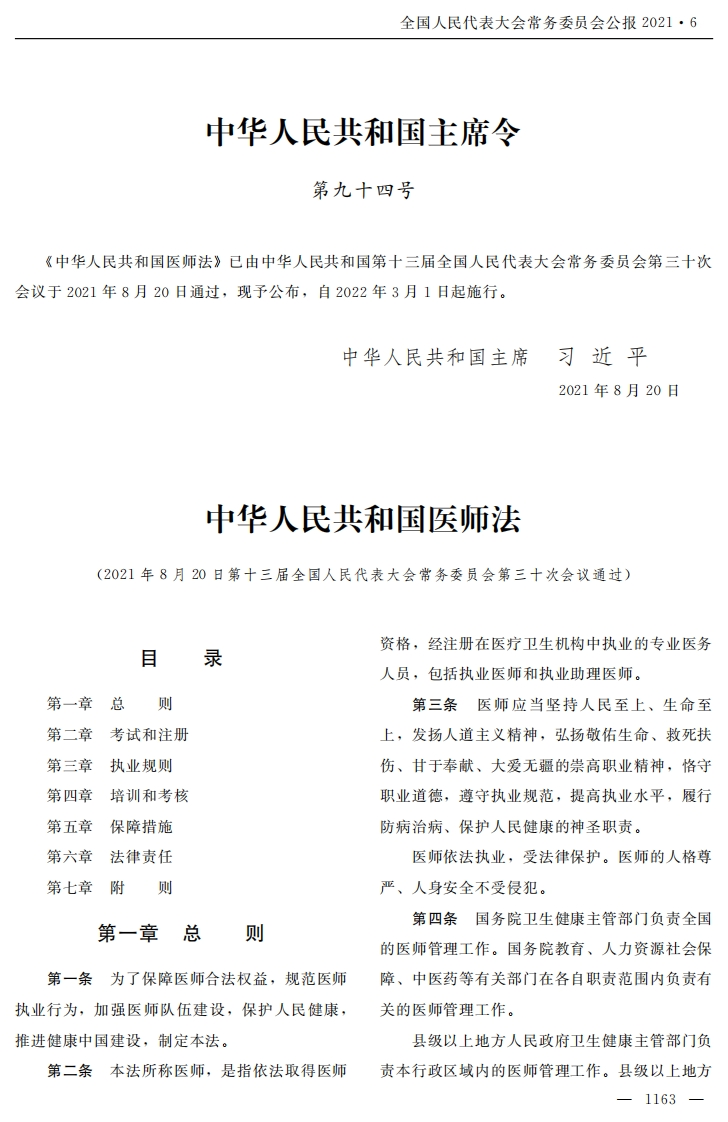 全国人民代表大会常务委员会公报2021·6中华人民共和国主席令第九十四号《中华人民共和国医师法》已由中华人民共和国第十三届全国人民代表大会常务委员会第三十次会议于2021年8月20日通过,现予公布,自2022年3月1日起施行。中华人民共和国主席习近平2021年8月20日中华人民共和国医师法(2021年8月20日第十三届全国人民代表大会常务委员会第三十次会议通过)资格,经注册在医疗卫生机构中执业的专业医务目录人员,包括执业医师和执业助理医师。第一章总则第三条医师应当坚持人民至上、生命至第二章考试和注册上,发扬人道主义精神,弘扬敬佑生命、救死扶第三章执业规则伤、甘于奉献、大爱无疆的崇高职业精神,恪守第四章培训和考核职业道德,遵守执业规范,提高执业水平,履行第五章保障措施防病治病、保护人民健康的神圣职责。第六章法律责任医师依法执业,受法律保护。医师的人格尊第七章附则严、人身安全不受侵犯。第四条国务院卫生健康主管部门负责全国第一章总则的医师管理工作。国务院教育、人力资源社会保第一条为了保障医师合法权益,规范医师障、中医药等有关部门在各自职责范围内负责有执业行为,加强医师队伍建设,保护人民健康,关的医师管理工作。推进健康中国建设,制定本法。县级以上地方人民政府卫生健康主管部门负第二条本法所称医师,是指依法取得医师责本行政区域内的医师管理工作。县级以上地方-1163-