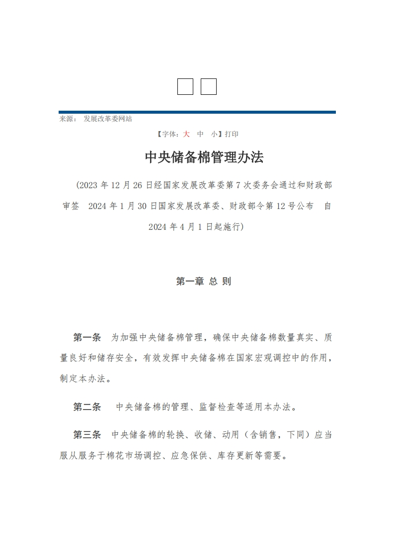 来源:发展改革委网站【字体:大中小】打印中央储备棉管理办法(2023年12月26日经国家发展改革委第7次委务会通过和财政部审签2024年1月30日国家发展改革委、财政部令第12号公布自2024年4月1日起施行)第一章总则第一条为加强中央储备棉管理,确保中央储备棉数量真实、质量良好和储存安全,有效发挥中央储备棉在国家宏观调控中的作用,制定本办法。第二条中央储备棉的管理、监督检查等适用本办法。第三条中央储备棉的轮换、收储、动用(含销售,下同)应当服从服务于棉花市场调控、应急保供、库存更新等需要。