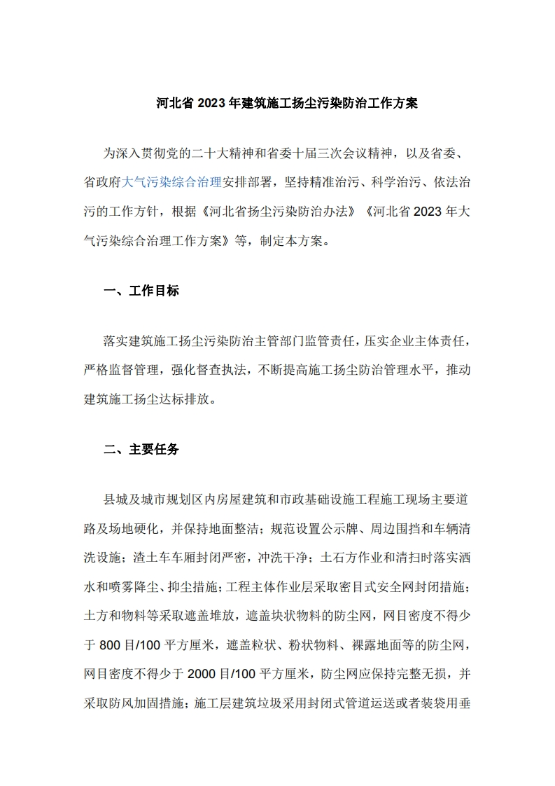 河北省2023年建筑施工扬尘污染防治工作方案为深入贯彻党的二十大精神和省委十届三次会议精神,以及省委、省政府大气污染综合治理安排部署,坚持精准治污、科学治污、依法治污的工作方针,根据《河北省扬尘污染防治办法》《河北省2023年大气污染综合治理工作方案》等,制定本方案。一、工作目标落实建筑施工扬尘污染防治主管部门监管责任,压实企业主体责任,严格监督管理,强化督查执法,不断提高施工扬尘防治管理水平,推动建筑施工扬尘达标排放。二、主要任务县城及城市规划区内房屋建筑和市政基础设施工程施工现场主要道路及场地硬化,并保持地面整洁:规范设置公示牌、周边围挡和车辆清洗设施:渣土车车厢封闭严密,冲洗干净:土石方作业和清扫时落实洒水和喷雾降尘、抑尘措施:工程主体作业层采取密目式安全网封闭措施:土方和物料等采取遮盖堆放,遮盖块状物料的防尘网,网目密度不得少于800目/100平方厘米,遮盖粒状、粉状物料、裸露地面等的防尘网,网目密度不得少于2000目/100平方厘米,防尘网应保持完整无损,并采取防风加固措施:施工层建筑垃圾采用封闭式管道运送或者装袋用垂