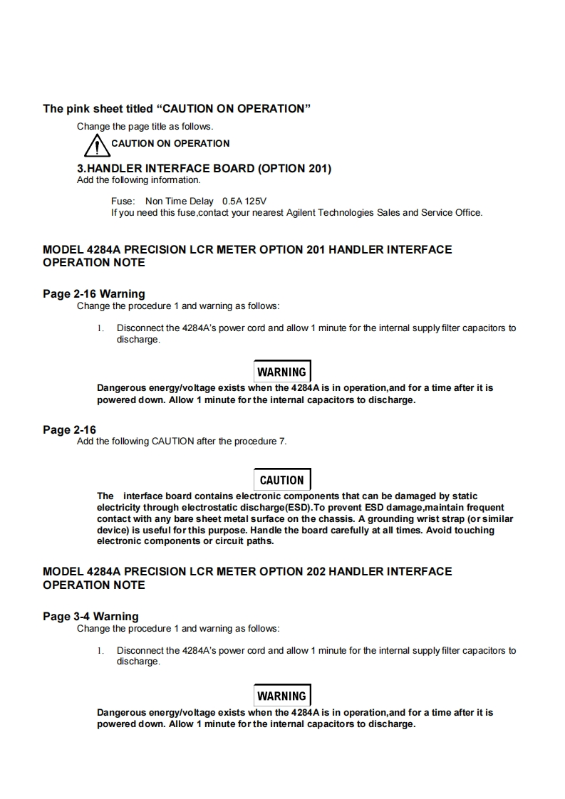 MANUAL CHANGESAgilent 4285AMANUAL IDENTIFICATIONPrecision LCR MeterModel Number:4285ADate Printed:March 2000Part Number:04285-90010Operation ManualThis supplement contains information for correcting manual errors and for adapting the manual to newer instruments that containsimprovements or modifications not documented in the existing manual.To use this supplement1.Make all ERRATA corrections2.Make all appropriate senial-number-related changes listed belowSERIAL PREFIX OR NUMBERMAKE MANUALSERIAL PREFIX OR NUMBERMAKE MANUALCHANGESCHANGESA11◆New ItemERRATACHANGES 1CHANGE 1 contains the information needed to adapt the 4285A's manualChanged the company name from YOKOGAWA-HEWLETT-PACKARD,LTD.,or its abbreviation YHP to AgilentTechnologies Japan,Ltd.NOTEManual change supplement are revised as often as necessary to keep manuals as current and accurate as possible.Agilent Technologiesrecommends that you periodically request the latest edition of this supplement.Free copies are available from all Agilent Technologies officesWhen requesting copies,quote the manual identification information from your supplement,or the model number and print date from the titlepage of the manualDate/Div:March 2000/33Page 1 of 3Agilent TechnologiesPRINTED IN JAPAN