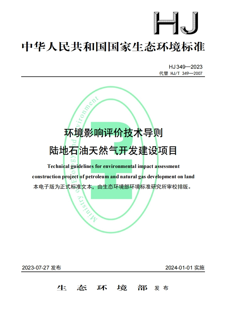 HJ中华人民共和国国家生态环境标准HJ349-2023代替HJ/T349一2007ronment环境影响评价技术导则陆地石油天然气开发建设项目Technical guidelines for environmental impact assessmentconstruction project of petroleum and natural gas development on land本电子版为正式标准文本,由生态环境部环境标准研究所审校排版。2023-07-27发布2024-01-01实施生态环境部发布