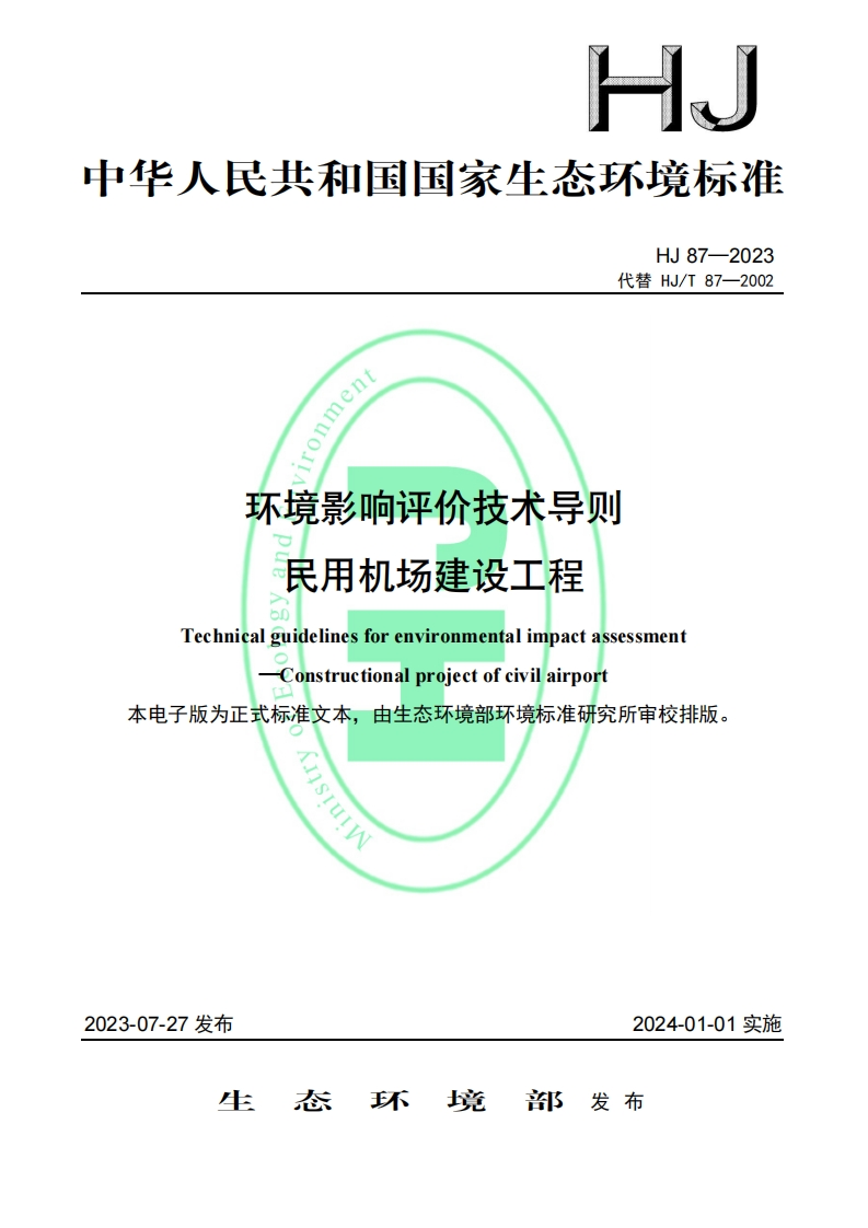 HJ中华人民共和国国家生态环境标准HJ87-2023代替HJ/T87一2002ironment环境影响评价技术导则民用机场建设工程onTechnical guidelines for environmental impact assessment-Constructional project of civil airport本电子版为正式标准文本,由生态环境部环境标准研究所审校排版。2023-07-27发布2024-01-01实施生态环境部发布