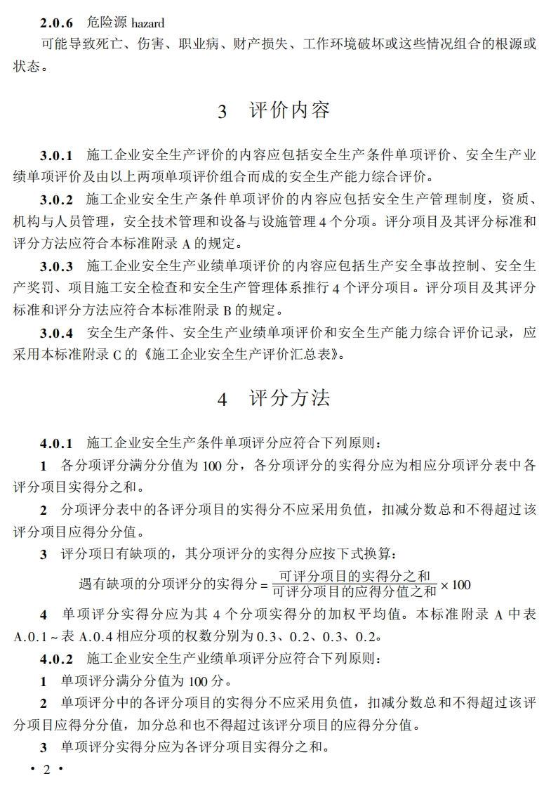 施工企业安全生产评价标准JGJ/T77-2003J278—20031总则1.0.1为加强施工企业安全生产的监督管理,科学地评价施工企业安全生产条件、安全生产业绩及相应的安全生产能力,实现施工企业安全生产评价工作的规范化和制度化,促进施工企业安全生产管理水平的提高,制定本标准。1.0.2本标准适用于施工企业及政府主管部门对企业安全生产条件、业绩的评价,以及在此基础上对企业安全生产能力的综合评价。1.0.3本标准依据《中华人民共和国安全生产法》、《中华人民共和国建筑法》等有关法律法规,结合现行国家标准《职业健康安全管理体系规范》GB/T28001的要求制定。1.0.4对施工企业安全生产能力进行综合评价时,除应执行本标准的规定外,尚应符合国家现行有关强制性标准的规定。2术语2.0.1施工企业construction company从事土木工程、建筑工程、线路管道和设备安装工程、装修工程的新建、扩建、改建活动的各类资质等级的施工总承包、专业承包和劳务分包企业。2.0.2安全生产work safety为预防生产过程中发生事故而采取的各种措施和活动。2.0.3安全生产条件condition of work safety满足安全生产的各种因素及其组合。2.0.4安全生产业绩Performance of work safety在安全生产过程中产生的可测量的结果。2.0.5安全生产能力capacity of work safety安全生产条件和安全生产业绩的组合。·1
