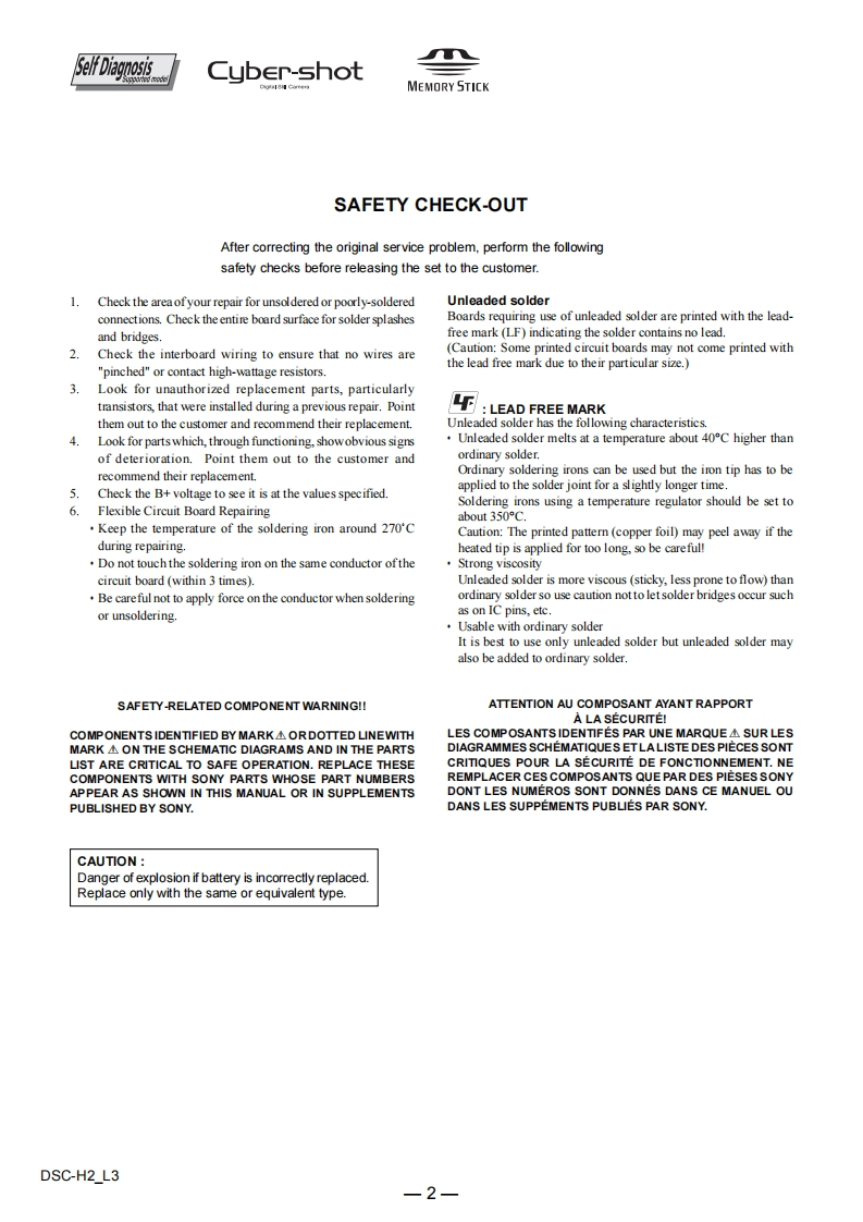 DSC-H2SERVICE MANUALLEVEL 3US ModelVer.1.32006.10Canadian ModelRevision HistoryAEP ModelUK ModelHow to useEModelAcrobat ReaderAustralian ModelChinese ModelInternal memoryArgentina ModelON BOARDHong Kong ModelKorea ModelTourist ModelLinkSERVICE NOTEPRINTED WIRING BOARDSSCHEMATIC DIAGRAMSREPAIR PARTS LISTNote:Note:The components identified byLes composants identifies pamark or dotted line with markune marque sont critiquesAare critical for safety.pour la securit怕.Replace only with part numberNe les remplacer que par unespecified.piece portant le numero spcifie.DIGITAL STILL CAMERASONYDSC-H2_L32006J1600-12006.109-876-937-11Sony EMCS Co.Published by Kohda TEC