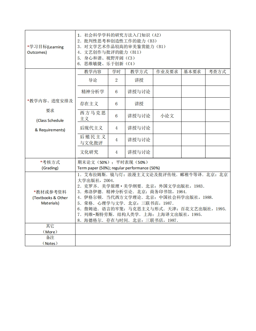 《西方现代文艺思潮》课程教学大纲课程基本信息(Course Information)课程代码*学时32*学分(Credit2(Course Code)Hours)(Credits)*课程名称西方现代文艺思潮(Course Name)Modern Thoughts in Western Literature and Art课程性质专业选修课(Course Type)授课对象中文三年级本科生(Audience)授课语言(Language of Instruction)中文*开课院系(School)人文学院中文系先修课程文学概论、西方文论(Prerequisite)授课教师(Instructor)施立峻课程网址(Course Webpage)《西方现当代文艺思潮》是面向中文本科生开设的一门专业选修课,以西方现代文艺美学思潮的发展和演变为历史线索,概括性地介绍和分析各种学说,*课程简介(Description)梳理其中的基本观念及其理论形态,借此帮助学生了解西方现代美学观念,深入把握西方文化的现代精神,为进一步的学术思考建立必要的美学价值参照。Western Literary Theory is a Professional elective course for all undergraduatesof Chinese majors.With the development of the western aesthetic thoughts history*课程简介(Description)for clues,Western Literary Theory will introduce and analysis the basic concept andtheory of the 20th century,Which to help students explore the universality ofmodern western aesthetic concepts,And further to grasp the inner modern spirit ofwestern culture and establish the further academic thinking and reference value.课程教学大纲(course syllabus)