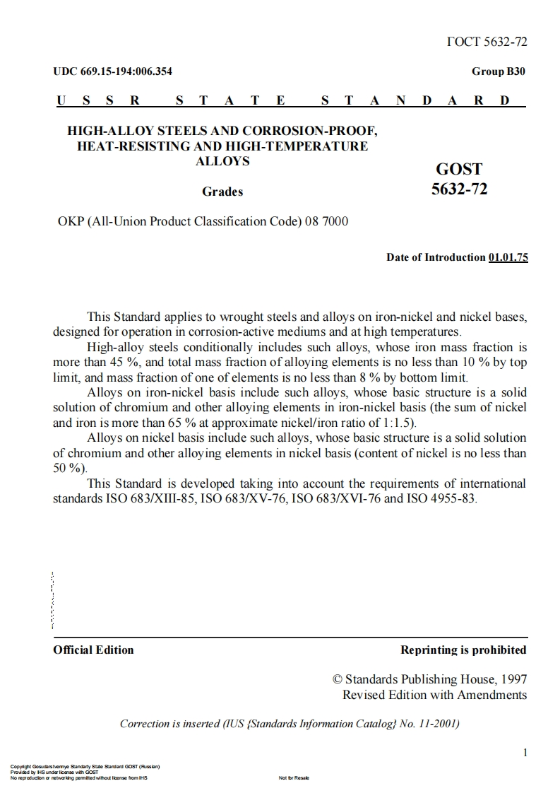 U SS R S T A T E ST A N D A R DHIGH-ALLOY STEELS ANDCORROSION-PROOF,HEAT-RESISTINGAND HIGH-TEMPERATURE ALLOYSGRADESG0ST5632-72Official EditionEnglish Version Approved by InterstandardSTANDARDS PUBLISHING HOUSEMoscow-ww一e andard T (n)