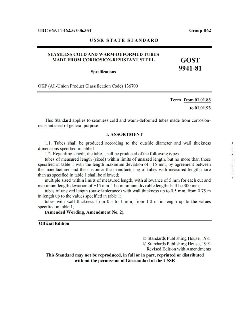 USSR STATE STANDARDw.ee.e.ee.no.u.ue..e.n.e...e.ne..e.e.e.e..e.uSEAMLESS COLD AND WARM-DEFORMEDTUBESMADE FROM CORROSION-RESISTANT STEELSPECIFICATIONSG0ST9941-81Official EditionUSSR STATE COMMITTEE FOR PRODUCTQUALITY MANAGEMENT AND STANDARDSMoscow