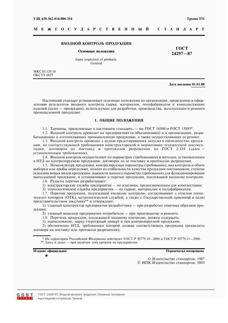 r0CT24297-87M EK T O C y IA P C T B E HH bI C TA HI A P TBXOIHON KOHTPOJIb nIPOIyKIINNOCHOBHbIEΠOJIOKEHNM3 anne o中HuHaabHoeMIIK H3HATEJIbCTBO CTAHIAPTOBMocksaG▣5TTOCT 24297-87,BxonHOM KOHTponb nponyKMM.OCHOBHble nonokeHnRInput inspecfion of products.General