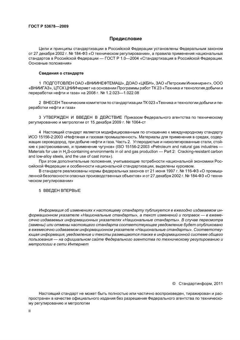 EDEPANbHOE ArEHTCTBOnO TEXHNYECKOMy PErynMPOBAHNIO N METPONOTNMHAUMOHANbHbIN「OCTPCTAHAAPT53678-POCCNNCKON2009ΦEAEPA4MM(MC015156-2:2003)HedTAHaa n ra3oBaa npoMblwneHHOCTbMATEPNANbI A nPNMEHEHNAB CPELAX,COLEPXKALLNX CEPOBOLOPOnPN OBbIYE HEOTN N rA3AYacTb 2yrnepo ncTble n Hn3KonernpoBaHHble cTann,CToNKne K pactpecKnBaHnO,n npnMeHeHne yyryHOB1S015156-2:2009Petroleum and natural gas industries-Materials for use inH2S-containing environments in oil and gas production-Part 2:Cracking-resistant Carbon and low-alloy steels,and the use of cast irons(MOD)M3paHne oonunanbHoeMockBaCTaHnapTMHφopM2011