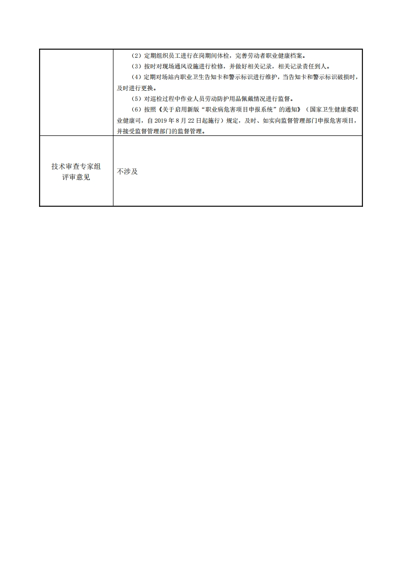 职业卫生技术报告公开信息表鑫安利XAL/ZPJL-2016-162建设单位(用人单位)阿拉善耀能绿电新能源开发有限公司名称建设单位(用人单位)建设单位(用人地址阿拉普盟阿左旗巴彦诺日公苏木境内单位)联系人杨文欢项目名称阿拉善耀能绿电新能源开发有限公司职业病危害因素检测报告电站装机规模为300MW,安装60台GW191-5.0-110的金风风力发电机组,通过12回共计85.4公里的35kV集电线路接入220kV升压站,升压站安装2台项目简介型号为SFZB20-200000220变压器,配置90兆瓦/180兆瓦时储能设备,最终通过阿拉善盟电业局投资建设的31.5km220kw送出线路,接入阿拉腾敖包220kv变电站项目组人员吴洋楠、闫育培现场调查人员吴洋楠、闫育培调查时间建设单位(用人单位)2024.8.2杨文欢陪同人员现场采样、检测建设单位(用人单位)现场采样、检测人员吴洋楠、闫育培2024.8.4时间陪同人员杨文欢中国现场调查、现场采样、现场检测的图像影像华然都尔勃吉风储南(1)存在的职业病危害因素根据用人单位工作场所产生或存在的职业病危害因素情况及接触人数、接触限值、接触建设项目(用人单位)时间及频度等,确定用人单位重点评价的职业病危害因素有:工频电场、噪声。存在的职业病危害因素(2)本次测量该用人单位接触噪声工作点共24个,结果显示24个工作点噪声均未超及检测结果过85dBA)。本次测量该用人单位接触工频电场工作点共24个,结果显示24个工作点工频电场强度均未超过5000Vm。针对本次现场调查和工作场所职业病危害因素检测评价过程中发现的问题,提出以下建议:评价结论与建议(1)定期组织职业卫生相关培训,培训人员应包括用人单位主要负责人、职业卫生管理人员和接触职业病危害的劳动者:培训的内容应包括职业卫生法律、法规、规章、操作规程、所在岗位的职业病危害及其防护设施、个人职业病防护用品的使用和维护、劳动者所享有的职业卫生权利等内容。培训应做好记录工作,档案资料应有专人负责保管。