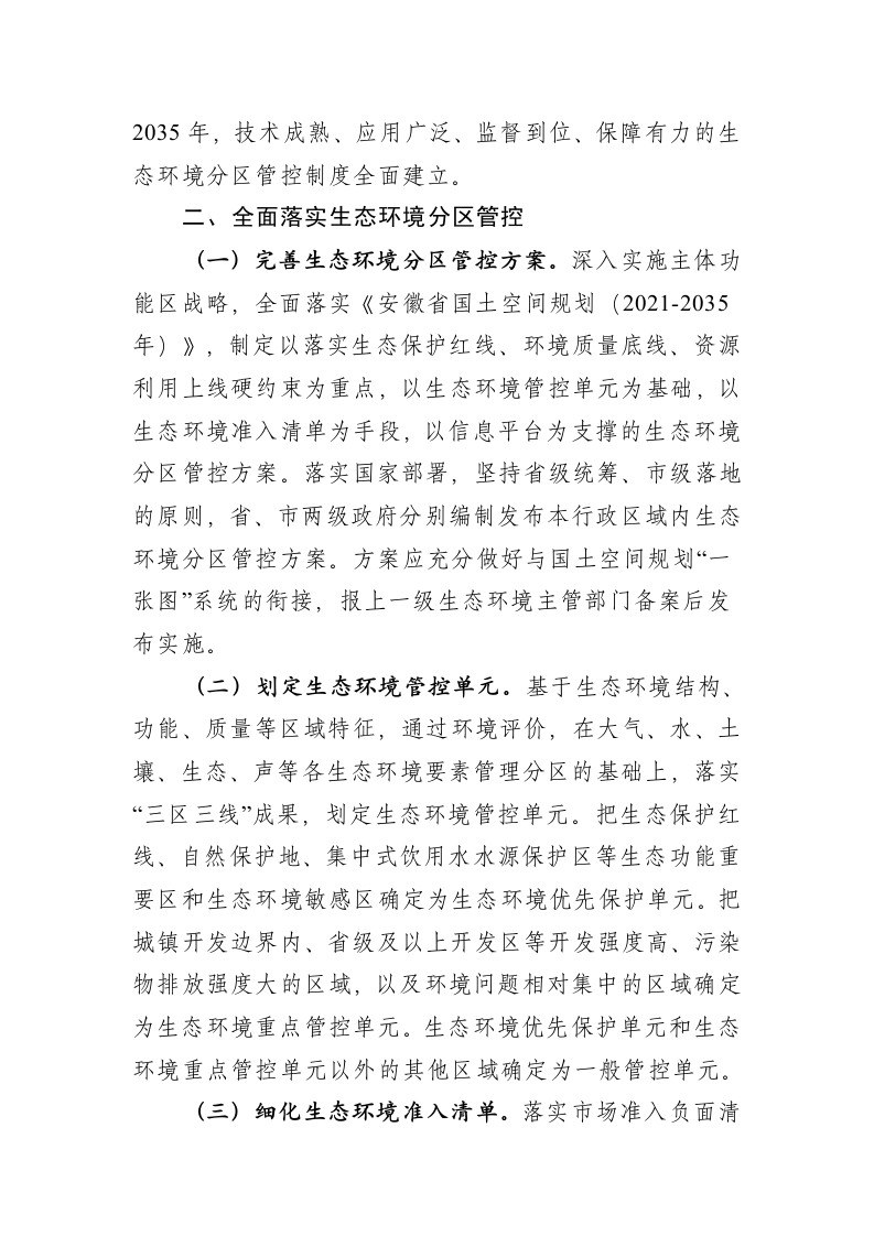 安徽省关于加强生态环境分区管控的实施意见(征求意见稿)为深入贯彻落实《中共中央办公厅国务院办公厅关于加强生态环境分区管控的意见》,实施分区域差异化精准管控,严守生态保护红线、环境质量底线、资源利用上线,科学指导各类开发保护建设活动,全面打造美丽安徽,结合我省实际,提出如下实施意见。一、总体要求加强生态环境分区管控,要坚持以习近平新时代中国特色社会主义思想特别是习近平生态文明思想为指导,深入贯彻党的二十大及二十届二中全会精神,认真落实习近平总书记关于安徽工作的重要讲话重要指示精神,全面落实全国生态环境保护大会部署,完整、准确、全面贯彻新发展理念,加快构建新发展格局,协同推进降碳、减污、扩绿、增长,以保障生态功能和改善环境质量为目标,坚持生态优先,绿色发展;源头预防,系统保护;精准科学,依法管控;明确责任,协调联动等原则,实施生态环境分区管控,扎实推进山水秀美的生态强省建设,以高水平保护支撑安徽高质量发展,为加快建设人与自然和谐共生的美丽中国作出安徽贡献。到2025年,全域覆盖、科学精准的生态环境分区管控体系初步形成,支撑美丽安徽建设迈出坚实步伐。到