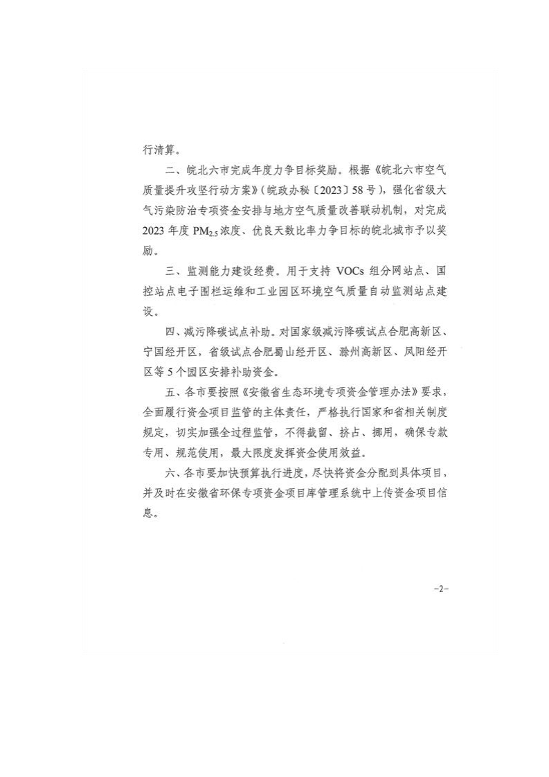 安徽省生态癸夷月财文件皖财资环〔2024〕245号安徽省财政厅安徽省生态环境厅关于下达2024年第二批省级大气污染防治专项资金的通知各市财政局、生态环境局:为加快我省大气污染防治,根据《安徽省生态环境专项资金管理办法》(皖财资环〔2022〕838号)等有关规定,现下达2024年第二批省级大气污染防治专项资金(具体金额详见附件,支出列“211-节能环保支出”),有关事项通知如下:一、2023年度环境空气质量生态补偿激励清算资金。根据《安徽省环境空气质量生态补偿激励办法》(皖环发〔2022〕60号),依据2023年度全年空气质量情况,对此前预拨的补偿激励资金进-1