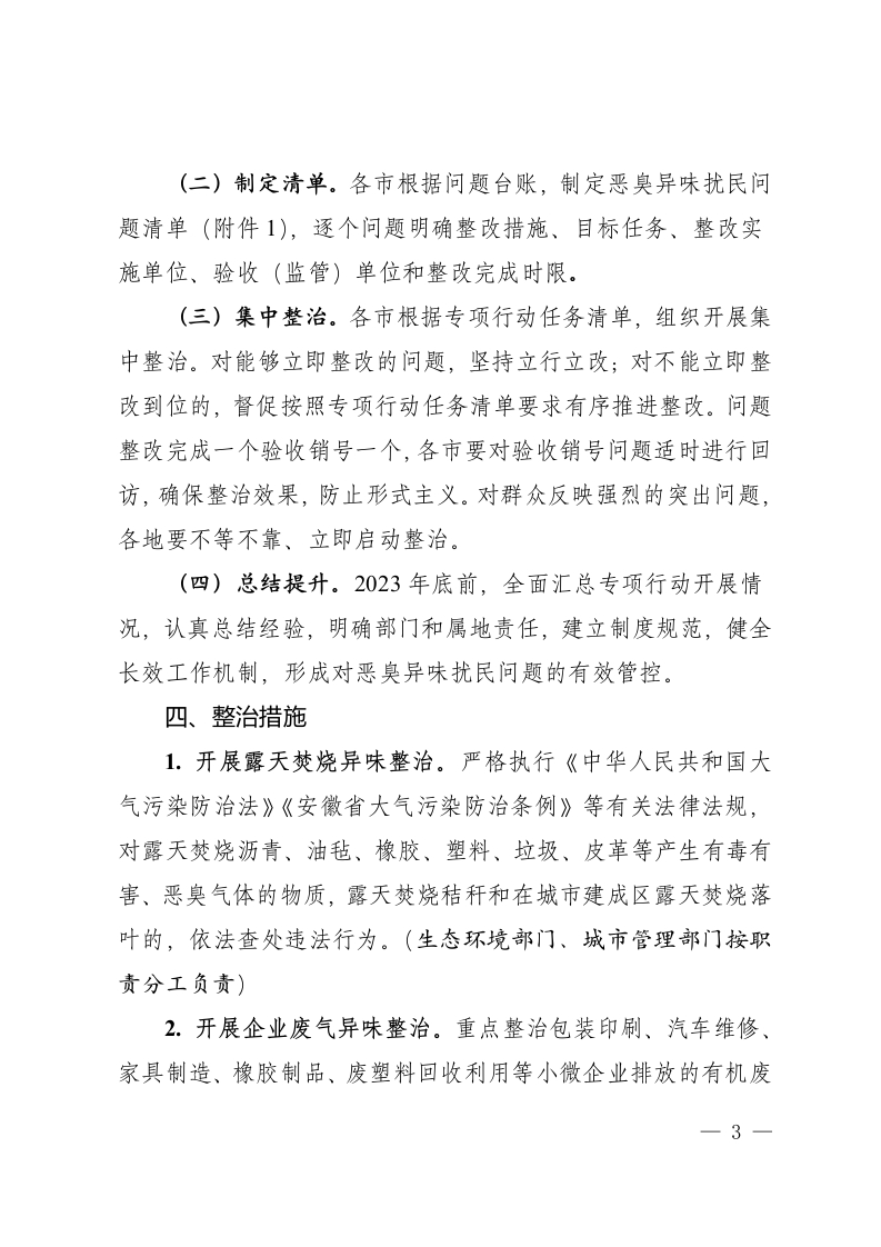 安徽省整治恶臭异味扰民问题保障人民群众合法环境权益专项行动万案(征求意见稿)为深入贯彻落实全国及全省生态环境保护工作大会精神,回应解决群众关心关切的恶臭异味问题,不断增强人民群众的获得感、幸福感、安全感,制定本方案。一、总体要求深入学习贯彻习近平生态文明思想,坚持精准治污、科学治污、依法治污,与正在开展的全省整治餐饮油烟和噪声扰民问题保障人民群众合法环境权益专项行动同步,全面开展恶臭异味扰民问题整治,切实保障人民群众的合法环境权益,有效推进解决群众“家门口”环境问题。二、工作目标通过实施专项行动,全省恶臭异味扰民问题得到有效整治,投诉举报数量力争同比2022年下降20%以上。同时建立长效治理机制,保持投诉举报数量逐步下降趋势。三、工作步骤(一)排查梳理。各市组织对2023年以来辖区内所有恶臭异味扰民问题投诉举报情况进行梳理,分县(市、区)和分领域建立问题台账。2