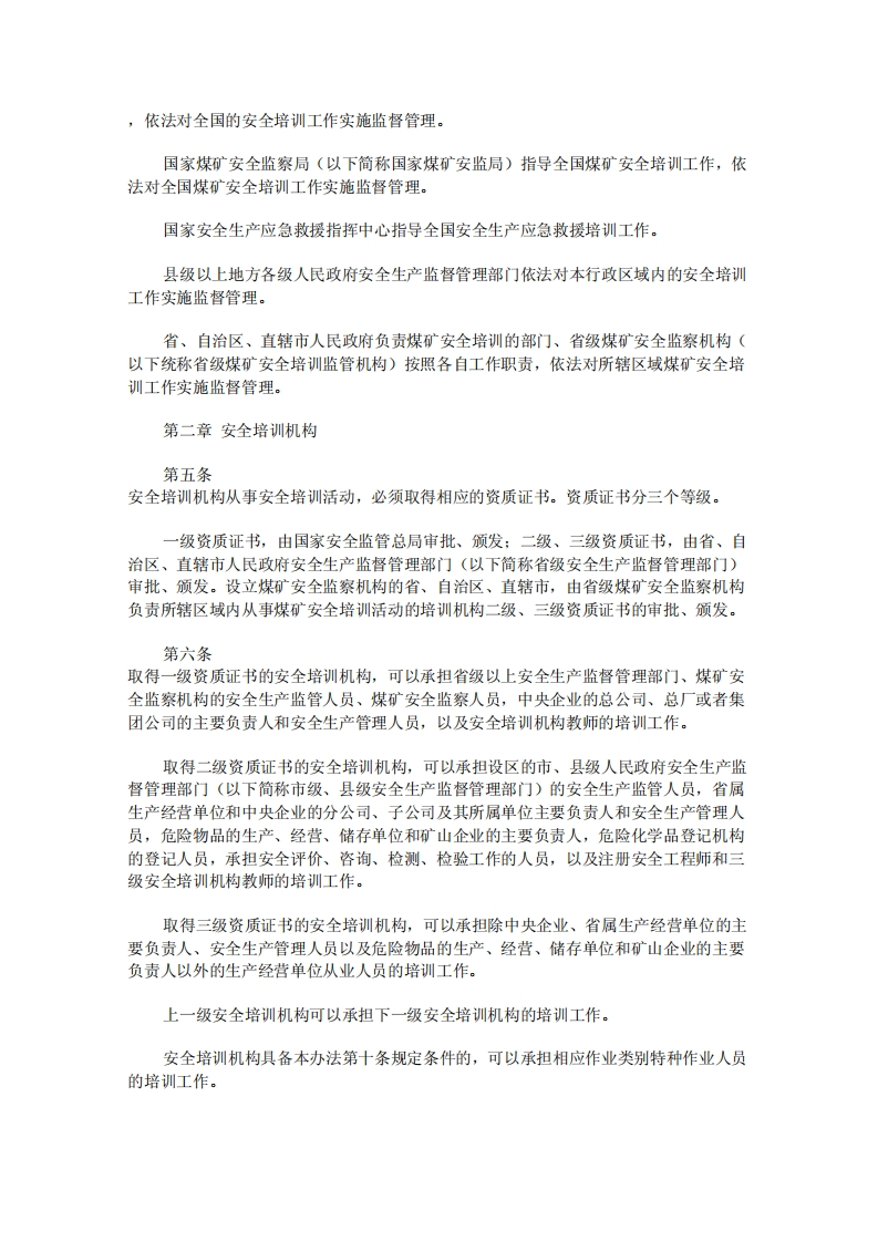 国家安全生产监督管理总局令第44号安全生产培训管理办法[2012年2月20日]第44号新修订的《安全生产培训管理办法》已经2011年12月31日国家安全生产监督管理总局局长办公会议审议通过,现予公布,自2012年3月1日起施行。原国家安全生产监督管理局(国家煤矿安全监察局)2004年12月28日公布的《安全生产培训管理办法》同时废止。国家安全生产监督管理总局骆琳二O一二年一月十九日安全生产培训管理办法第一章总则第一条为了加强安全生产培训管理,规范安全生产培训秩序,保证安全生产培训质量,促进安全生产培训工作健康发展,根据《中华人民共和国安全生产法》和有关法律、行政法规的规定,制定本办法。第二条安全培训机构、生产经营单位从事安全生产培训(以下简称安全培训)活动以及安全生产监督管理部门、煤矿安全监察机构、地方人民政府负责煤矿安全培训的部门对安全培训工作实施监督管理,适用本办法。第三条本办法所称安全培训是指以提高安全监管监察人员、生产经营单位从业人员和从事安全生产工作的相关人员的安全素质为目的的教育培训活动。前款所称安全监管监察人员是指县级以上各级人民政府安全生产监督管理部门、各级煤矿安全监察机构从事安全监管监察、行政执法的安全生产监管人员和煤矿安全监察人员:生产经营单位从业人员是指生产经营单位主要负责人、安全生产管理人员、特种作业人员及其他从业人员:从事安全生产工作的相关人员是指从事安全教育培训工作的教师、危险化学品登记机构的登记人员和承担安全评价、咨询、检测、检验的人员及注册安全工程师、安全生产应急救援人员等。第四条安全培训工作实行统一规划、归口管理、分级实施、分类指导、教考分离的原则。国家安全生产监督管理总局(以下简称国家安全监管总局)指导全国安全培训工作