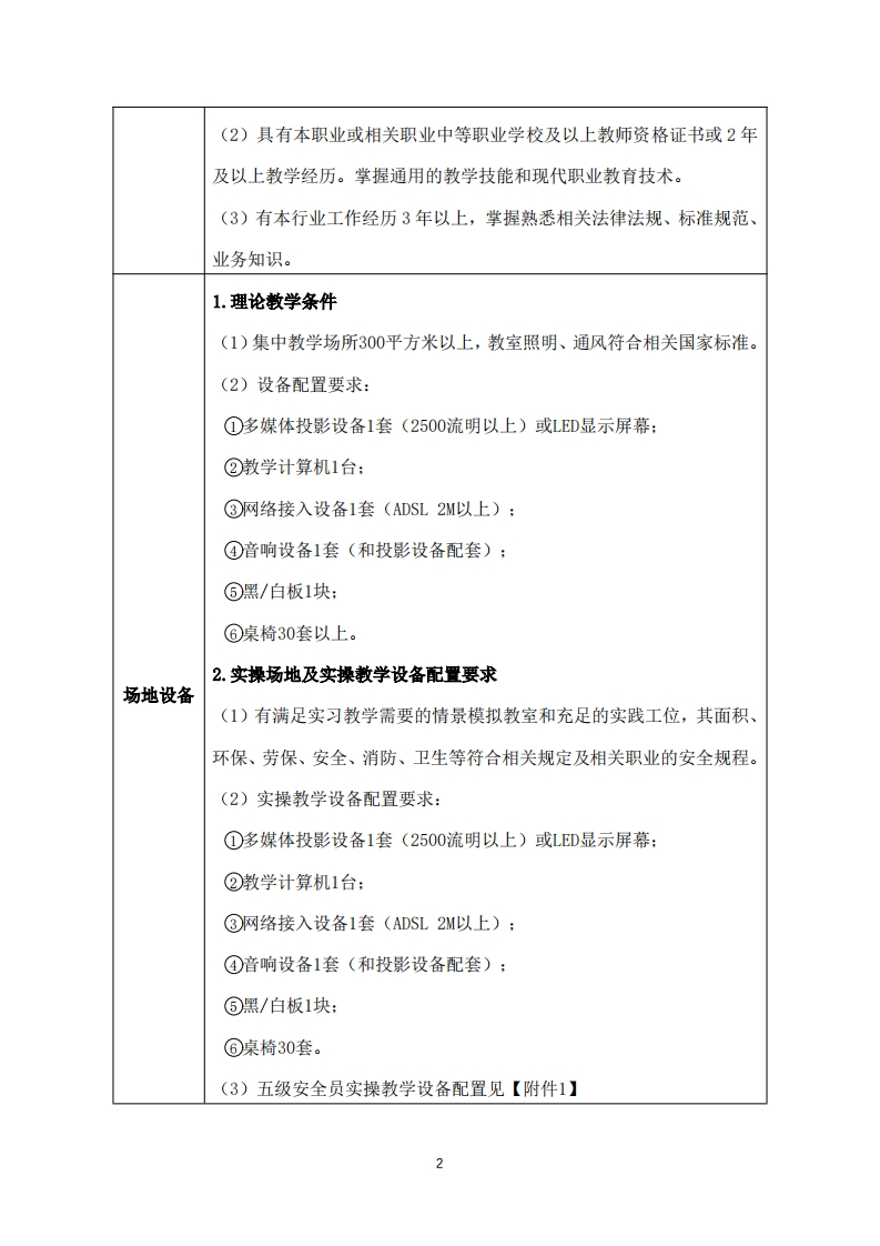 北京市朝阳区民办职业技能培训机构安全员培训设置标准(试行)一、职业名称:安全员从事生产工作现场安全、监督、检查、管理的人员。二、职业编码:6-31-06-00三、技术等级:安全员共设五个等级,分别为:五级/初级工、四级/中级工、三级/高级工、二级/技师、一级/高级技师。本培训设置标准仅规定五级/初级工、四级/中级工、三级/高级工的三个等级的设置要求。四、基础条件:1.举办五级/初级工安全员培训应具有本职业或相关职业教育培训经历。2.举办四级/中级工安全员培训应具有2年以上本职业五级教育培训经历。3.举办三级/高级工安全员培训应具有2年以上本职业四级教育培训经历。五、设置要求:五级/初级工安全员1.总量配置每班配备专兼职教师不少于3人。其中专职教师不少于1人,专业理论教师资条件师不少于1人,实操指导教师不少于2人。2.培训教师要求(1)具有本科以上学历或相关专业中级及以上专业技术职称。
