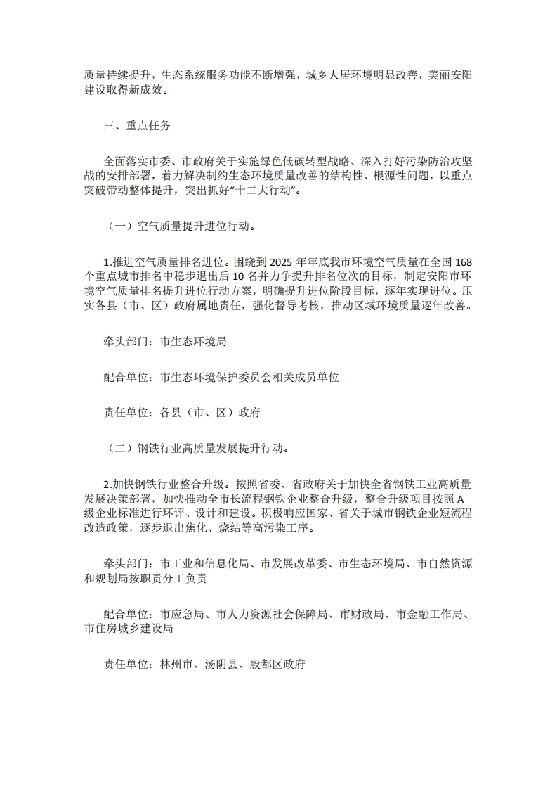 安阳市人民政府办公室关于印发安阳市推动生态环境质量稳定向好三年行动计划(2023-2025年)的通知各县(市、区)人民政府,市人民政府各部门及有关单位:《安阳市推动生态环境质量稳定向好三年行动计划(2023一2025年)》已经市政府同意,现印发给你们,请认真贯彻执行。2023年10月11日安阳市推动生态环境质量稳定向好三年行动计划(2023一2025年)为推动全市生态环境质量稳定向好,促进经济社会高质量发展,根据《河南省人民政府办公厅关于印发河南省推动生态环境质量稳定向好三年行动计划(2023一2025年)的通知》(豫政办(2023)33号)精神,结合我市实际,制定本行动计划。一、总体要求坚持以习近平新时代中国特色社会主义思想为指导,认真贯彻党的二十大精神,深入践行习近平生态文明思想,树牢“绿水青山就是金山银山”理念,扛稳生态环境保护政治责任,坚持生态优先、绿色发展,坚持因地制宜、分类施策,坚持标本兼治、综合治理,守牢法律法规、环保标准、环境质量只能变好不能变坏“三个底线”,严把准入、执法、督察问责“三个关口”,强化措施、压实责任,以更大力度、更实举措推进生态环境保护工作,推动全市生态环境质量稳定向好,努力建设人与自然和谐共生的美丽安阳。二、主要目标全面完成“十四五”生态环境质量和主要污染物总量减排目标。到2025年,全市细颗粒物浓度不高于47微克/立方米,空气质量优良天数比例达到62.5%,重污染天数比例不高于1.8%:8个国、省控地表水断面水质达到省定目标,劣V类水体和县级城市、县城建成区黑臭水体基本消除:受污染耕地安全利用率达到95%。重点建设用地安全利用得到有效保障:绿色低碳发展深入推进,生态环境