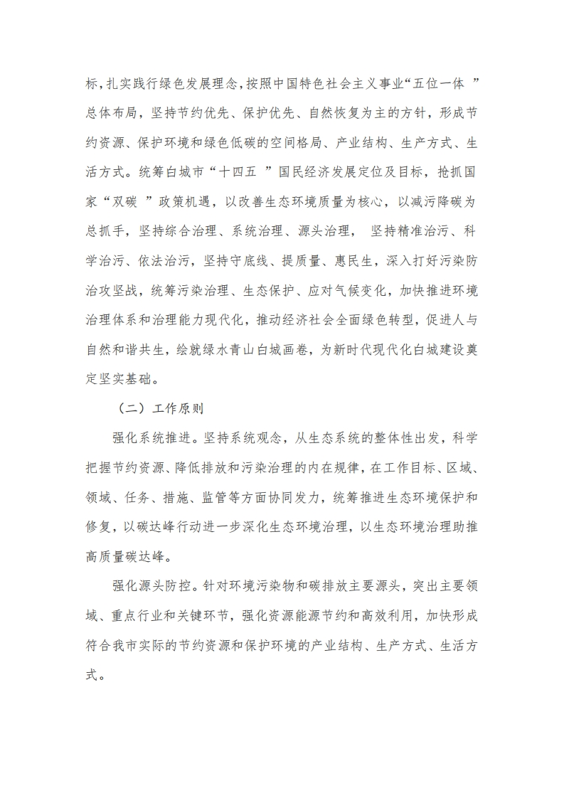 白城市减污降碳协同增效实施方案为深入贯彻党中央、国务院关于积极稳妥推进碳达峰碳中和重大战略署,统筹和加强应对气候变化,推动经济社会发展全面绿色转型,根据省生态环境厅等七部门印发的《吉林省减污降碳协同增效实施方案》(吉环发〔2022)16号),结合白城实际,制定本实施方案。一、面临形势“十四五”时期,生态文明建设进入以降碳为重点战略方向、推动减污降碳协同增效、促进经济社会发展全面绿色转型、实现生态环境质量改善由量变到质变的关键时期。党的十八大以来,我市生态文明建设和生态环境保护工作取得显著成效,生态环境质量得到改善,碳排放强度不断下降。但也要看到,我市生态环境保护正处于新老问题交织叠加的复杂阶段,生态环境结构性、根源性、趋势性压力总体上尚未根本缓解,产业结构、能源结构、交通运输结构等问题还较为突出,传统污染问题尚未得到根本解决,碳达峰碳中和又提出了新的要求,高质量实现碳达峰碳中和目标愿景任重道远。同时,基于传统污染物和碳排放特征,减污降碳协同是从根本上解决传统污染问题的战略路径,是推动经济结构转型升级的需要和降低减碳成本的有效手段。二、总体要求(一)指导思想以习近平新时代中国特色社会主义思想和生态文明思想为指导,全面贯彻党的二十大精神,坚持以人民为中心,以碳达峰碳中和为目