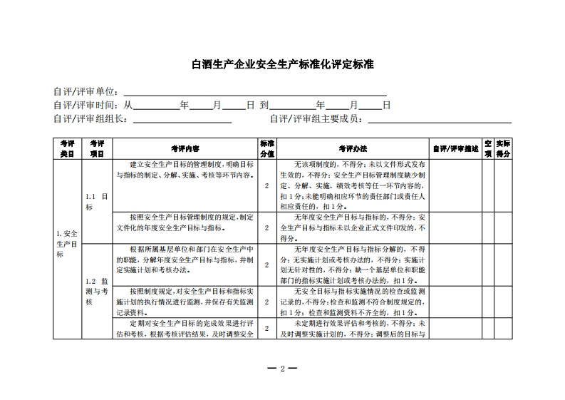 白酒生产企业安全生产标准化评定标准考评说明1.本评定标准适用于白酒生产企业。2.本评定标准共13项考评类目、47项考评项目和139条考评内容。3.在本评定标准的“自评/评审描述”列中,企业及评审单位应根据“考评内容”和“考评办法”的有关要求,针对企业实际情况,如实进行扣分点说明、描述,并在《自评扣分点及原因说明汇总表》(见附表)中逐条列出。4.本评定标准中累计扣分的,直到该考评内容分数扣完为止,不得出现负分。有需要追加扣分的,在该考评类目内进行扣分,也不得出现负分。5.本评定标准共计1000分。最终评审评分换算成百分制,换算公式如下:评定标准实际得分总计评审评分=×1001000-空项考评内容分数之和最后得分采用四舍五入,取小数点后一位数。6.标准化等级分为一级、二级和三级,一级为最高。评定所对应的等级须同时满足评审评分和安全绩效等要求,取最低的等级来确定标准化等级(见下表)。评定等级评审评分安全绩效一级≥90申请评审前一年内未发生重伤及以上的生产安全事故。二级≥75申请评审前一年内未发生人员死亡的生产安全事故。三级≥60申请评审前一年内发生生产安全事故死亡不超过1人。