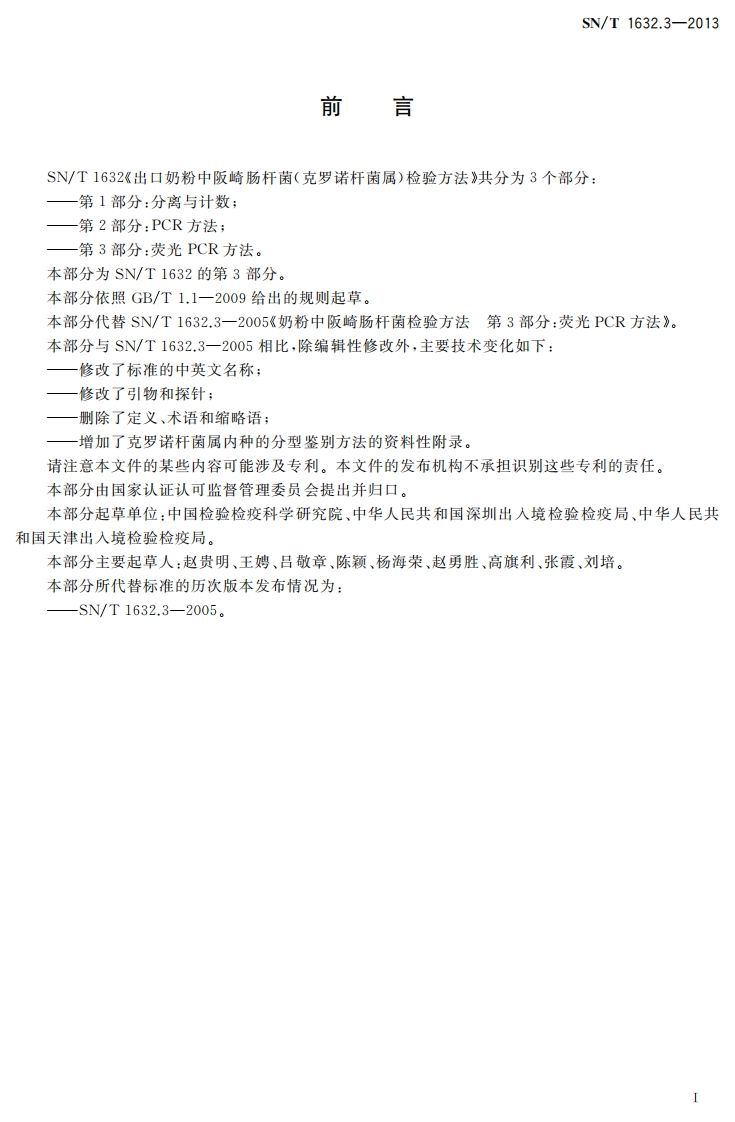 SN中华人民共和国出入境检验检疫行业标准SN/T1632.3-2013代替SN/T1632.3一2005出口奶粉中阪崎肠杆菌(克罗诺杆菌属检验方法第3部分:荧光PCR方法Determination of Enterobacter sakazakii(Cronobacter spp.)from dehydratedpowdered milk for export-Part 3:Real-time PCR method2013-11-06发布2014-06-01实施中华人民共和国国家质量监督检验检疫总局发布
