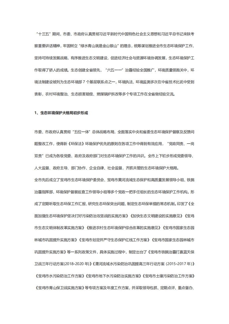 宝鸡市“十四五”生态环境保护规划“十四五”期间,是圆满完成第一个百年目标、开启第二个百年目标的起步期,也是实现2035年环境质量全面达标和2030年碳排放达峰的关键期。以习近平生态文明思想为指引,坚定不移贯彻新发展理念,紧扣推动高质量发展主题,构健新发展格局,科学编制“十四五”生态环境保护规划具有重要而深远的意义。“十四五”期间,是圆满完成第一个百年目标、开启第二个百年目标的起步期,也是实现2035年环境质量全面达标和2030年碳放达峰的关键期。以习近平生态文明思想为指引,坚定不移贯彻新发展理念,紧扣推云动高质量发展主题,构建新发展格局,科学编制”十四五”生态环境保护规划具有重要而深远的意义。规划编制过程中,以2035年广泛形成绿色生产生活方式,碳排放达峰后稳中有降,生态环境根本好转,美丽中国基本实现等为远景目标,坚持生态优先、绿色发展理念;以持续改善生态环境质量为核心,方向不变、力度不减,延伸深度、拓宽广度,深入打好污染防治攻坚战:以节能降碳为抓手,倒逼经济结构调整和高质量发展;以满足人民日益增长的优美生态环境需要为目的,突出精准治污、科学治污、依法治污,持续推进生态环境治理体系和治理能力现代化。同时,结合国家和陕西省生态环境保护重要方针、政策与文件和中省市国民经济和社会发展“十四五”规划,编制《宝鸡市”十四五”生态环境保护规划》。一、生态环境保护现状与形势(一)"十三五”生态环境保护成效