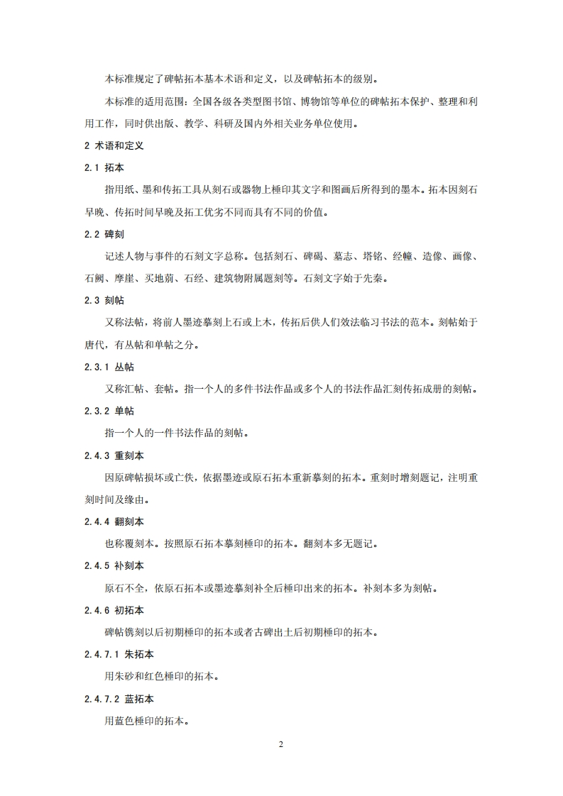 碑帖拓本定级标准前言本标准的编写格式和方法按《标准化工作导则第一部分:标准的结构和编写规则》(GB/T1.1-2000)和《标准化工作导则第二部分:标准中规范性技术要素内容的确定方法》(GB/T1.2-2002)中的规定编写。本标准为中华人民共和国文化行业标准。本标准由中华人民共和国文化部提出、批准并归口管理。本标准由国家图书馆古籍保护中心负责起草。本标准参加编写单位:国家图书馆、故宫博物院、文物出版社、上海图书馆、北京大学图书馆等。本标准的主要起草人:施安昌、孟宪钧、冀亚平、胡海帆、仲威、卢芳玉。引言中国是一个文明古国,有着悠久的历史和灿烂的文化。明代以前,中国一直是世界上发明最多的国家,传拓技术就是其中重要发明之一,由此而产生的碑帖拓本(或称拓片)是承载中华古代文明的重要载体。一千四百年来,拓本保存了重要的文献资料和丰富多彩的书法、绘画艺术。由于天灾人祸,唐、宋、元时代拓本幸存者寥若晨星,尤足珍贵。碑帖拓本拓制时间有早晚之别:保存的内容有完整、残缺和多少之异:原刻石与器物亦有存佚之殊:存在的形式有整幅拓本和剪裱本之别:文字种类有汉文和少数民族文字、外国文字之分别。为了加强对碑帖拓本的科学保护、合理利用,确定碑帖拓本的级别是十分必要的。参照中华人民共和国文化部2001年第19号令发布的《文物藏品定级标准》和《一级文物定级标准举例》记述碑帖拓本藏品定级的文件精神,并遵循鉴别碑帖拓本“三性原则”,同时考虑到全国各地所存碑帖的实际情况,制定本标准。本标准的定级对象,主要是1949年以前传拓的历代碑帖拓本。1范围